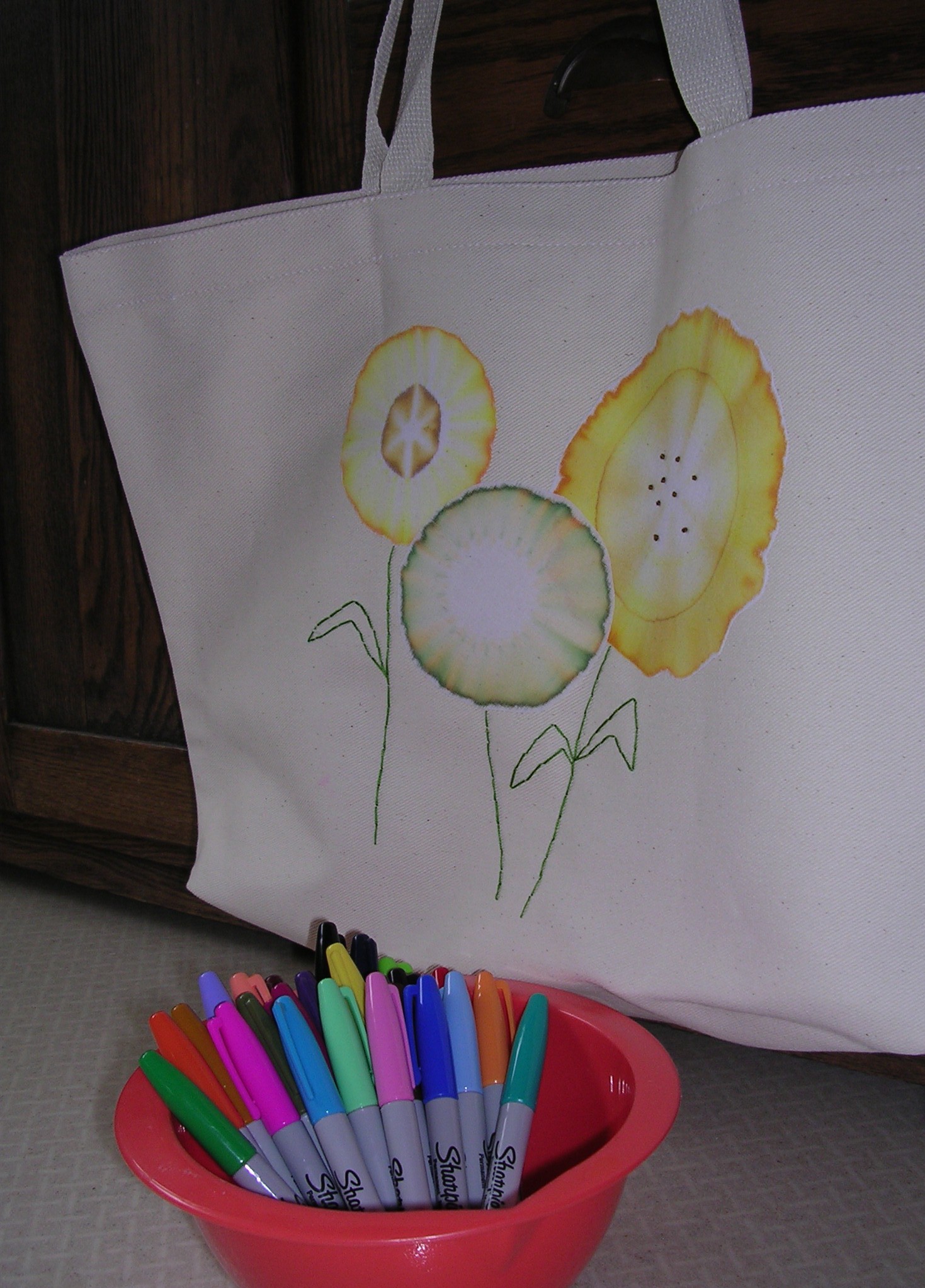 To eliminate the use of plastic and paper bags, I use canvas bags for grocery shopping and my weekly trip to the farmers market in the summertime. My plain jane cream-colored bags were begging for a hip new look so with a few markers, rubbing alcohol, a glass, a rubber band and an eyedropper… I have a bag worthy of its contents. Can you envision the bag bulging with in-season farmers' market products… a wooden pint box of raspberries, a bundle of asparagus spears, a jar of rhubarb strawberry jam and a loaf of homemade bread to slather it on, the first purple snap beans and peas of the season, lemon balm to flavor herbal tea, and some cutting garden flowers standing proudly upright tucked to one side? Markers come in so many summery colors with fun names… kiwi, dandelion, marigold, pink lemonade, and boysenberry. Wouldn't that be a dream job… to brainstorm marker names? The directions include a "movement of molecules, given the right solvent," science lesson tied in with the project. To tie it in with a learning objective and create a cute product… how fun is that?! A couple tips: Eyedroppers can be found at your local drug store in the eye care section by the contact lens solutions. Do the project outdoors or with the breeze blowing in through open windows. Permanent markers have a strong stench.