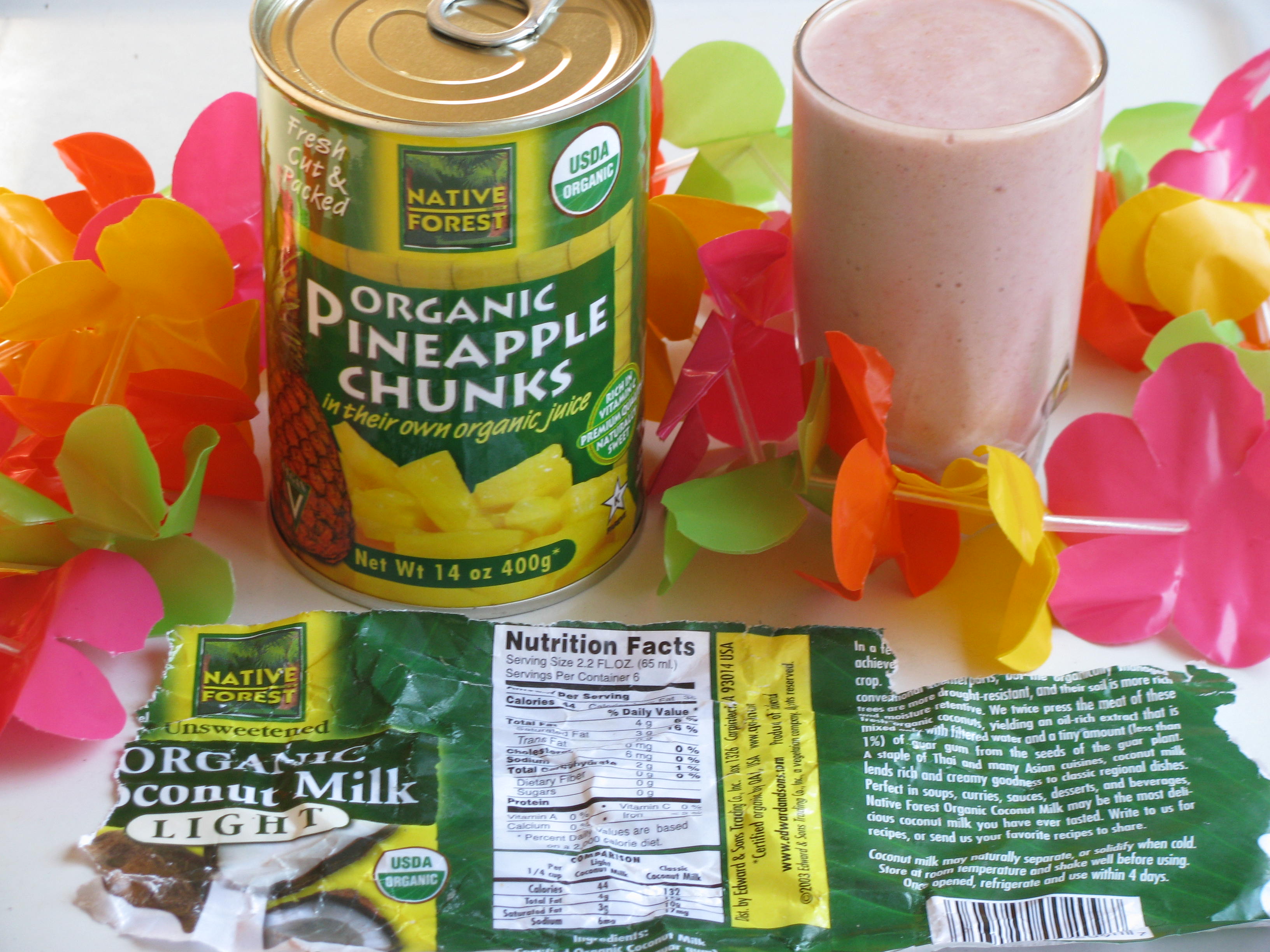 Today I decided to vary the Creamy Colada Smoothie recipe just a bit. I substituted pineapple juice for the orange juice, increased the coconut milk* to 1/2 c, eliminated the milk, and added 1/2 c strawberries. I used the 1/2 c. pineapple and 1 frozen banana, as in the original recipe, as well as added my usual flaxseed. That is the beauty of smoothies. You can do whatever floats your boat, you can march to the beat of a different drummer, or "If they give you ruled paper, write the other way." (Juan Ramon Jimenez) The coconut milk label is in such pitiful shape because I had already torn it from its can and tossed the can into a recycling bin when I decided to include it in my photo shoot. *Native Forest Coconut Milk, which is pictured in this post, contains organic coconut milk (organic coconut, water, and guar gum). An alternate brand, which is distributed by Natural Value, contains pure coconut extract and water… no guar gum. Without guar gum, it often solidifies, but you can simply warm the can prior to using.