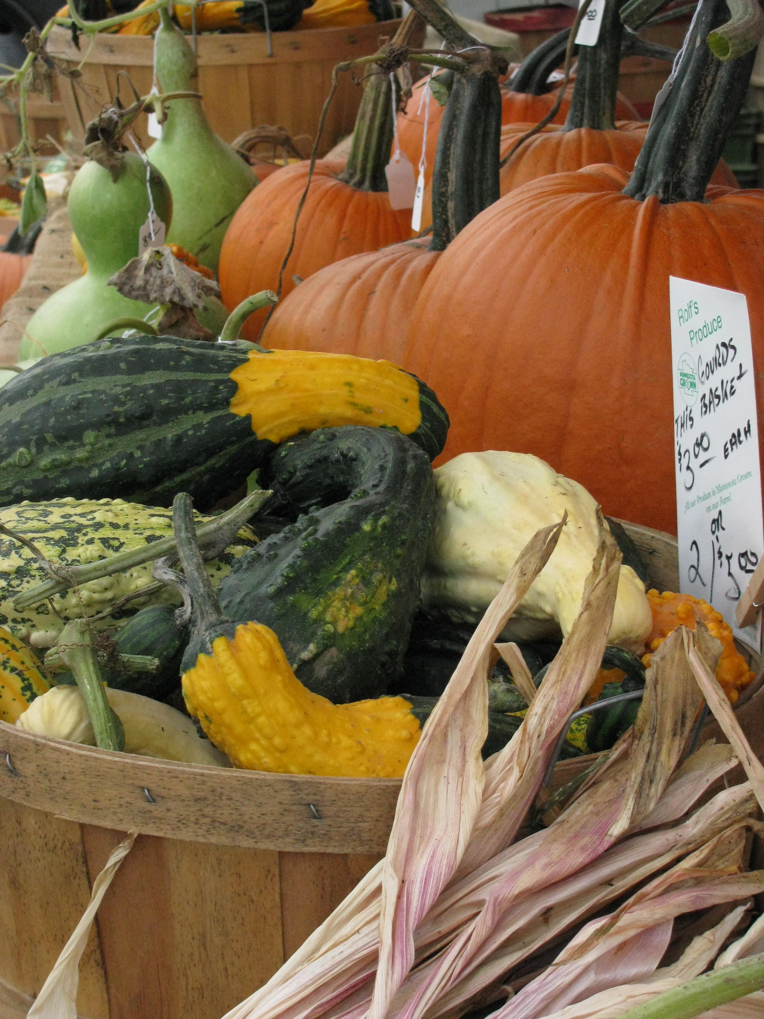 Over the weekend, Dick and I shopped the Minneapolis Farmers Market on Lyndale Avenue along with two of my daughters who were visiting… Lisa, with her husband and two kids from New Jersey, and Jessica from Florida. Jess and I broke away from the pack for a while to sit and listen to a jazz musician while we ate from a box of raspberries and shared an oatmeal flax muffin… both purchased from the market. Besides in-season freshly-harvested veggies, vendors were selling homemade cleaning products, flowers (I bought a huge orange-red colored potted mum.), cheese (I chose two bags of yummy slightly salty cheese curds.), as well as a variety of clothing and food. It would be fun to live closer to be able to shop the market every weekend but, even though our Brainerd Farmers market is much smaller, I find the variety and quality to be very good and I am grateful for the growers in our area.