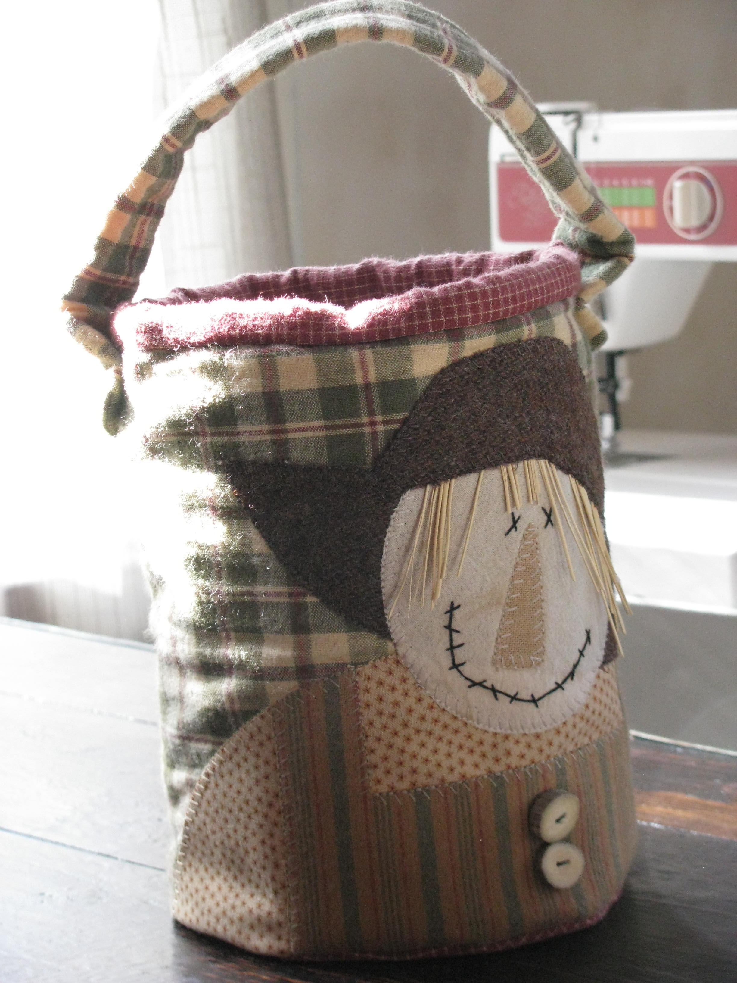 I made this lined scarecrow treat pail from mostly flannel and wool fabrics. A 3-gallon coffee can fits inside. Although it went together relatively quickly considering the many pieces that are each machine-appliqued in place, the hand embroidered face with the straw tucked underneath the hat, and the buttons stitched onto the front of the overalls… it is too labor-intensive to make one for each of my five grandkids to collect their treats on Halloween. So I purchased some candy corn themed cellophane bags to pack some treats to send them in the mail.