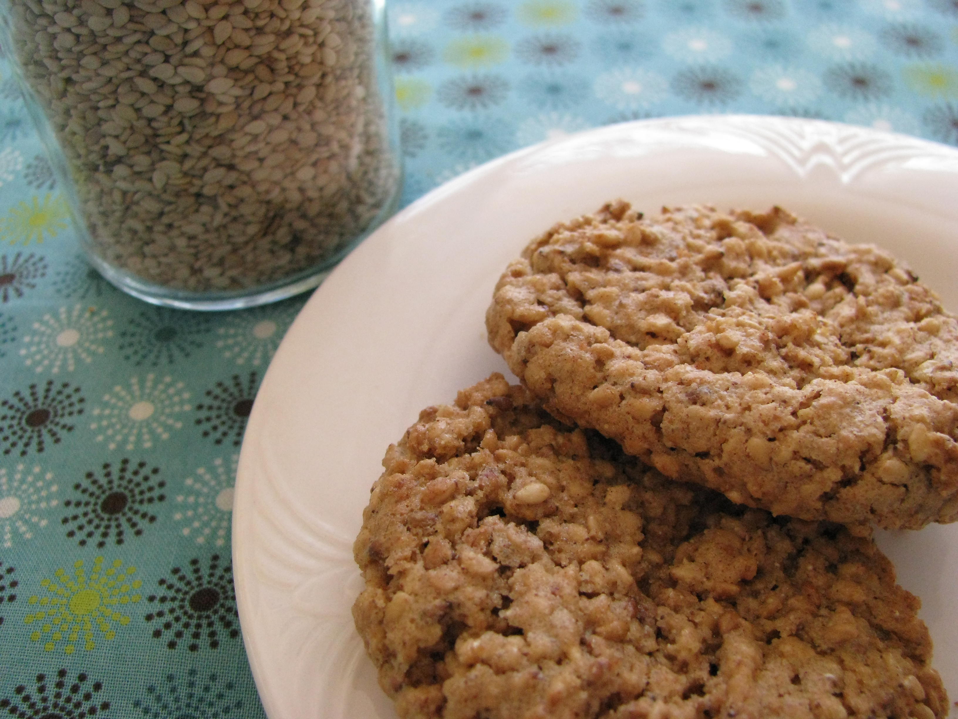 Did you know that "just a quarter-cup of sesame seeds supplies 74.0% of the daily value for copper, 31.6% of the DV for magnesium, and 35.1% of the DV for calcium? Also, sesame seeds are a good source of manganese, iron, phosphorus, vitamin B1 , zinc, and dietary fiber. In addition to these important nutrients, sesame seeds contain two unique substances: sesamin and sesamolin. Both of these substances belong to a group called lignans, which have a cholesterol-lowering effect, prevent high blood pressure, and increase vitamin E supplies. Sesamin has also been found to protect the liver from oxidative damage." For more in-depth information on sesame seeds as well as a myriad of information on eating healthy, go to the "World's Healthiest Foods" web site. Today I made cookies that have a whopping 1 cup of sesame seeds in a batch of 18 cookies. They are very tasty as is, but I think you could toss in a some dried fruit (i.e., raisins, dates, or figs) to change them up a bit then reduce the amount of brown sugar. Don't mess around buying the tiny jars of sesame seeds in the spice/seasonings grocery aisle. Arrowhead Mills sells a 12 oz. bag of organic sesame seeds. Note: In parenthesis, after some ingredients in the recipe, are substitutions suggested by Erica from PA who tried this recipe. I love to hear from readers! What wonderful suggestions to make these cookies even more nutritious!