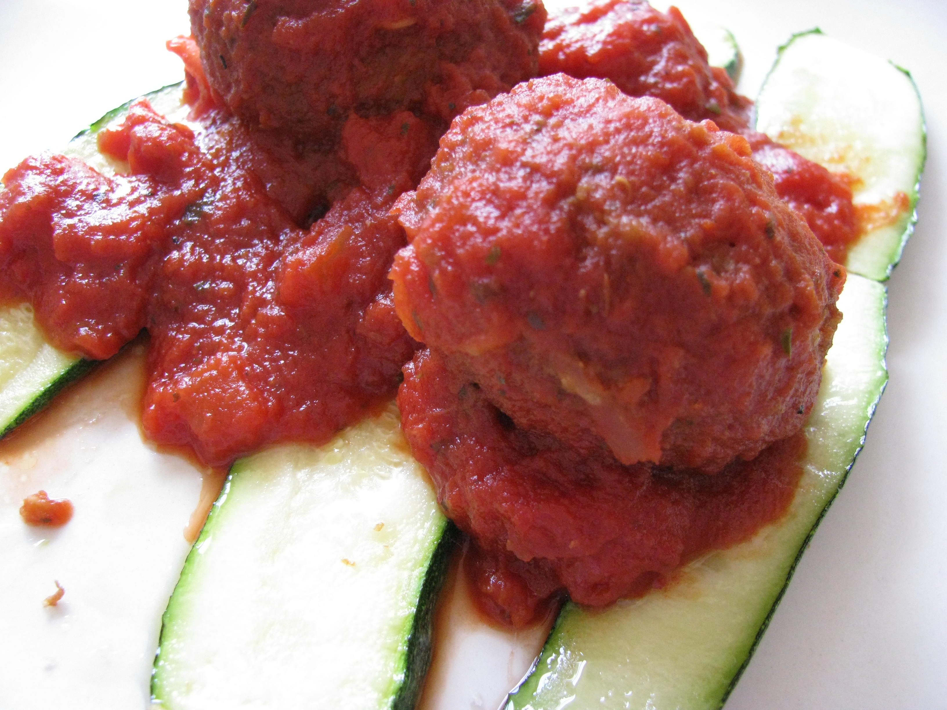 I placed some of the falafel in a pan to reheat along with some Muir Glen Italian Herb Pasta Sauce. Since my attempt earlier this week to purchase spaghetti squash as an alternative to pasta proved futile, I decided a good substitution might be zucchini. I sliced the zucchini then placed it on an olive oil coated unbleached parchment-lined baking sheet. After flipping the zucchini slices to evenly coat them with olive oil, I placed them in a 350 degree oven for 15-20 minutes… just enough to soften but still have a somewhat firm crunch. The result was one I will repeat.