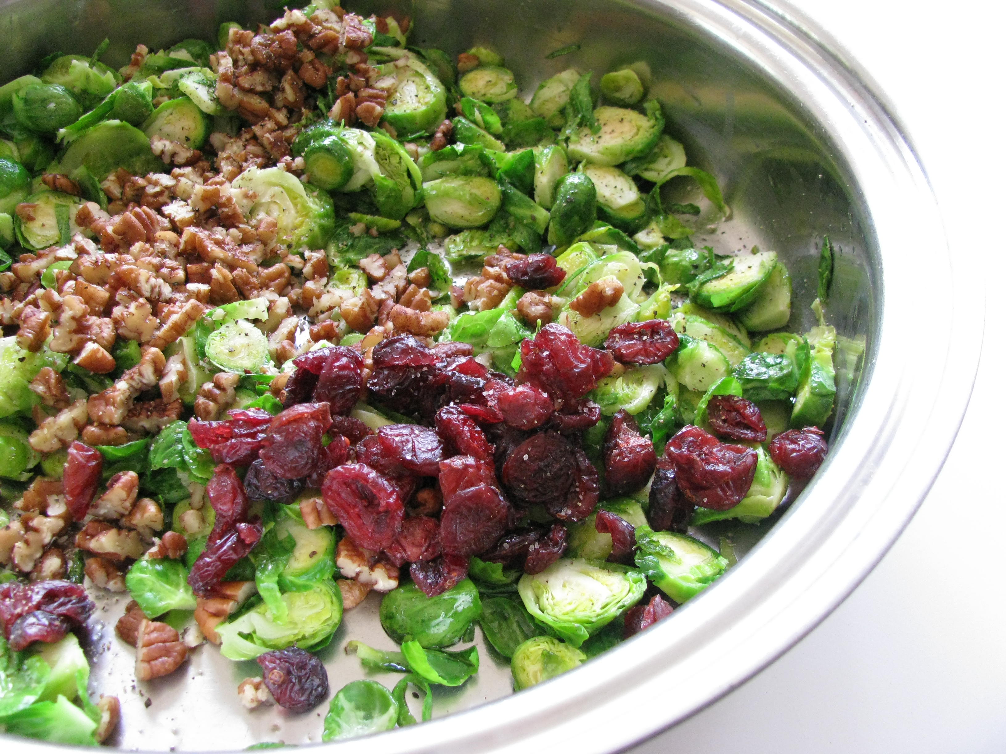 Slice the Brussels sprouts using the thinnest slicing disk of a food processor or slice thinly with a knife or mandoline. Set a 10-inch sauté pan over medium-high heat and add the pecans. Cook, stirring continually, until the pecans darken in color and begin to give off a toasted aroma, approx. 2 min. Add the butter (or olive oil) to the pan and stir to combine. Once the butter has melted (or olive oil has heated… caution: olive oil requires lower cooking temp), add the Brussels sprouts, salt, and pepper. Saute until the color brightens and the sprouts are just tender, approx. 6 min. Remove the pan from the heat and add the cranberries. Toss and serve.
