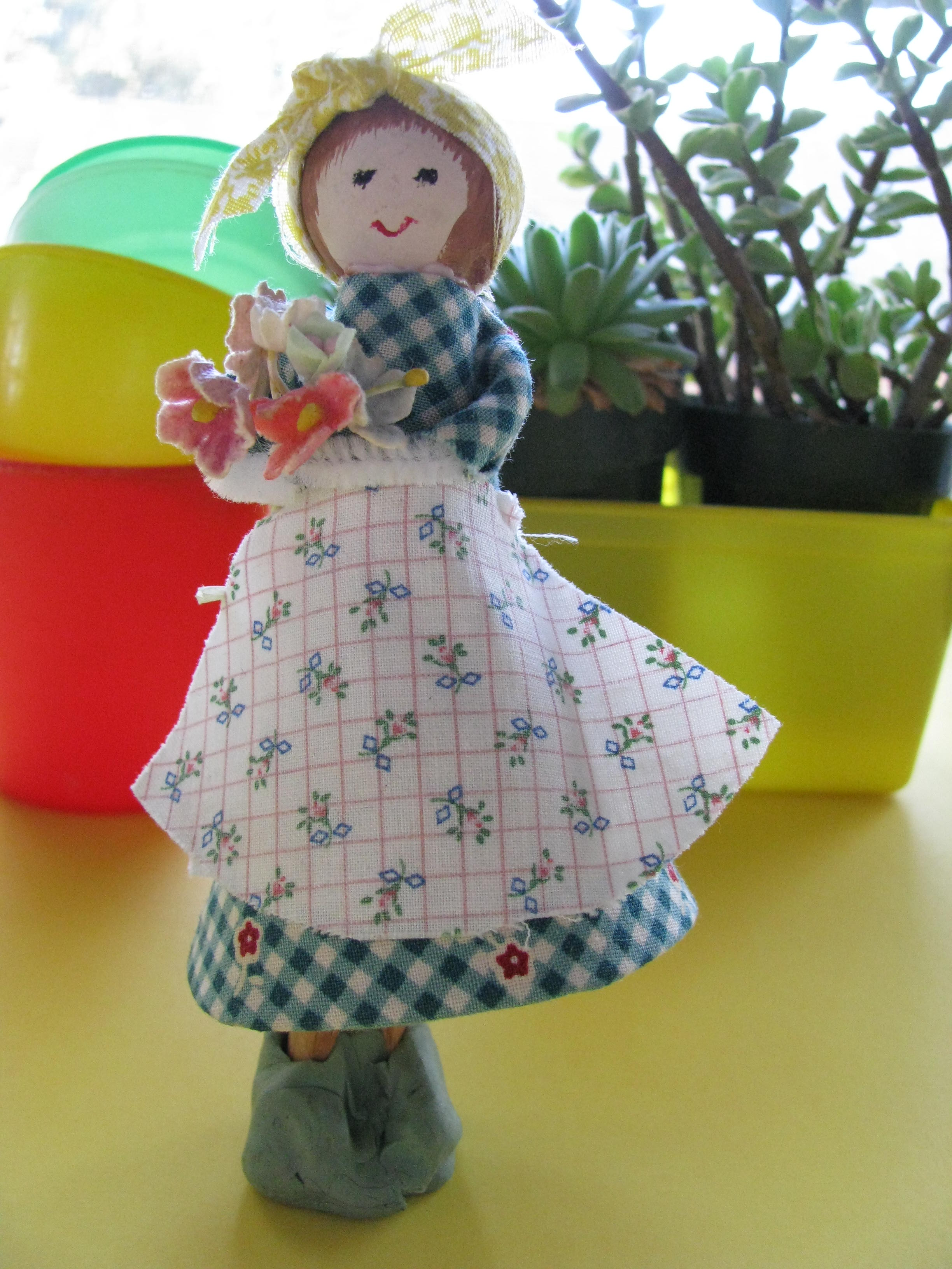 I formed the foundation of her skirt by creating a tagboard cone that I glued onto a clothespin… not the snap kind but the other variety. After gluing fabric onto the tagboard cone, I wrapped fabric around the upper part of the clothespin for the dress's bodice then wrapped fabric around a pipe cleaner that I had attached to the clothespin. I finished her except for the head. Today, for one strand of my "4 Cs"… craft, I finished my project by painting her hair, eyes, and mouth on a wooden ball and my "Tillie" was brought to life. Because she's happier in her garden tending her veggies, herbs, and flower beds than fussing with her hair, I wrapped a scarf around her head and slipped her into a pair of rubber gardening boots made from modeling clay.