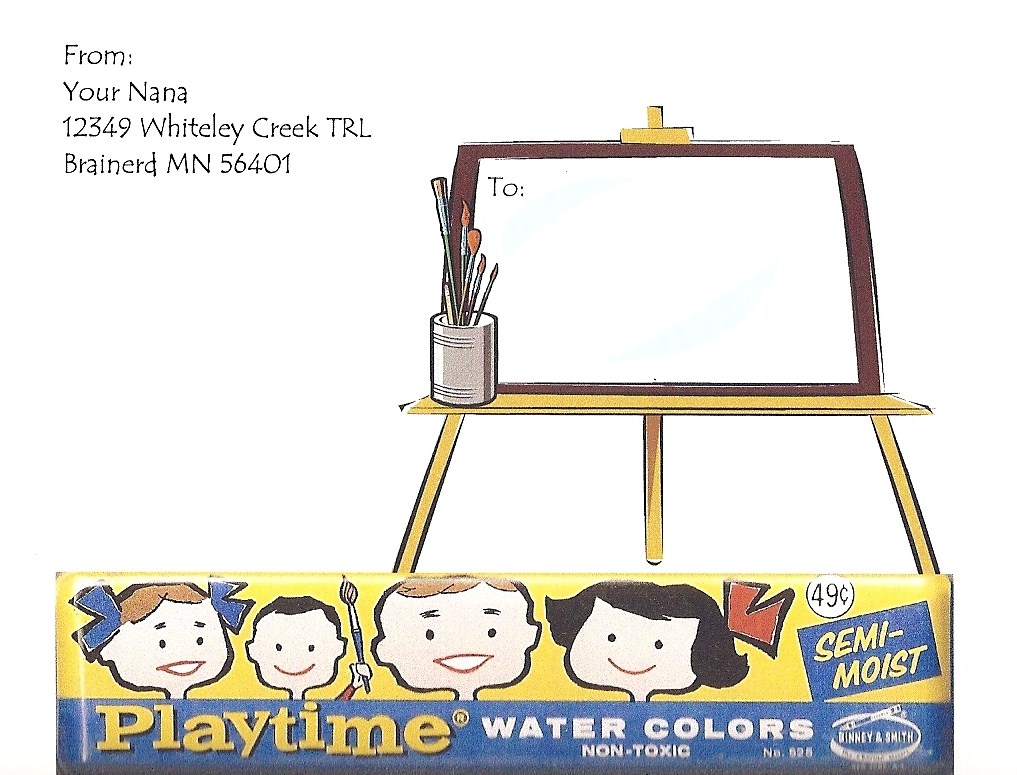 To make them, I scanned into my computer a vintage watercolor paint tin (with an unused paint palette and paintbrush inside), that I purchased at an antique sale, then inserted clipart of a tin can filled with paintbrushes. I think my 3 granddaughters and two grandsons will have fun receiving them in their mailbox in a few days.