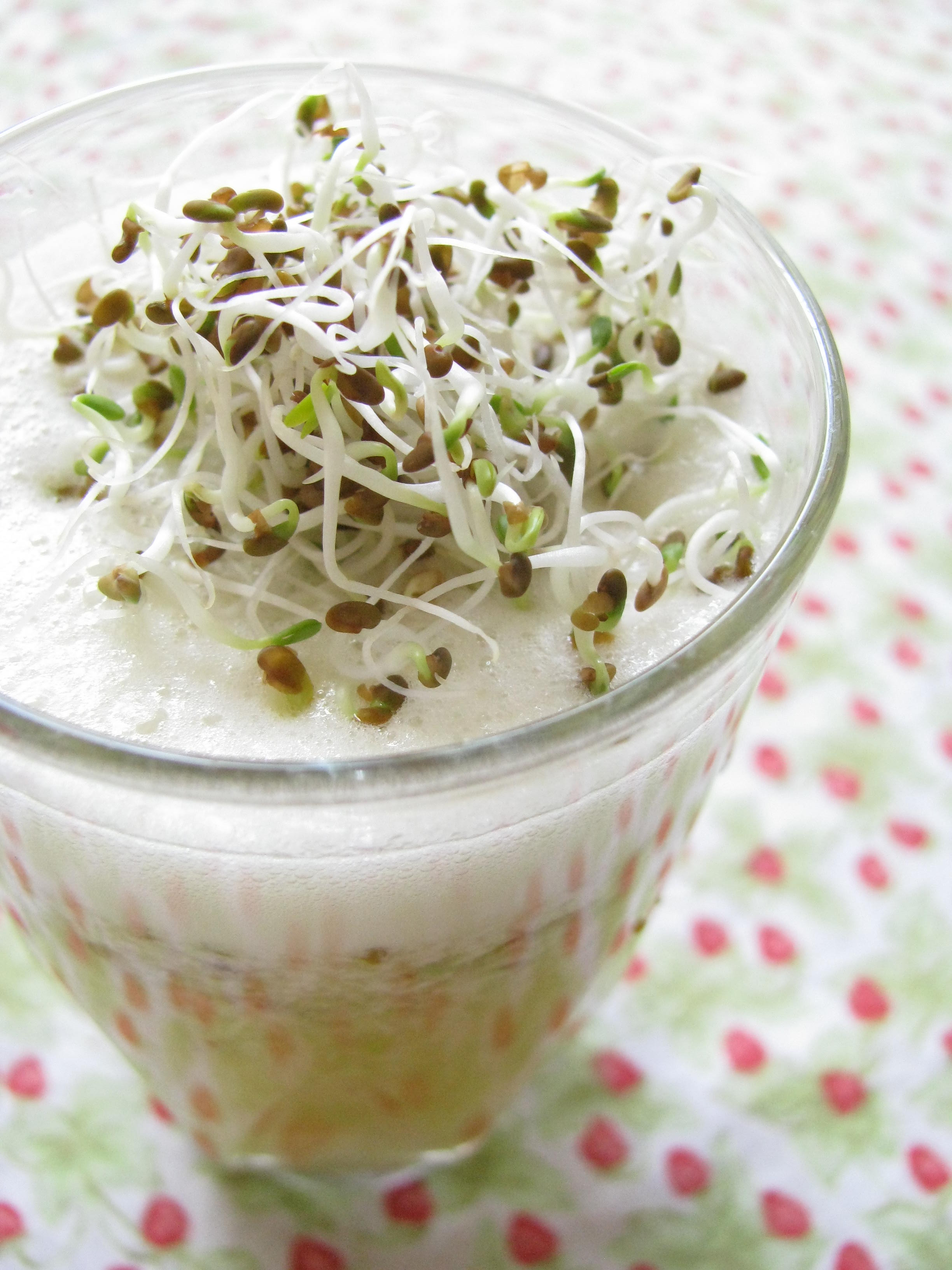 Dick was zapped by the cold bug, so I thought this would be a perfect day to ease him back to health with an alfalfa sprout concoction. I have set out to expand my use of sprouts, that are bursting forth in three jars on my kitchen counter, beyond a sandwich and salad topping. With this beverage, I have crossed the starting line. What a tasty way to enjoy nutrition at its peak!