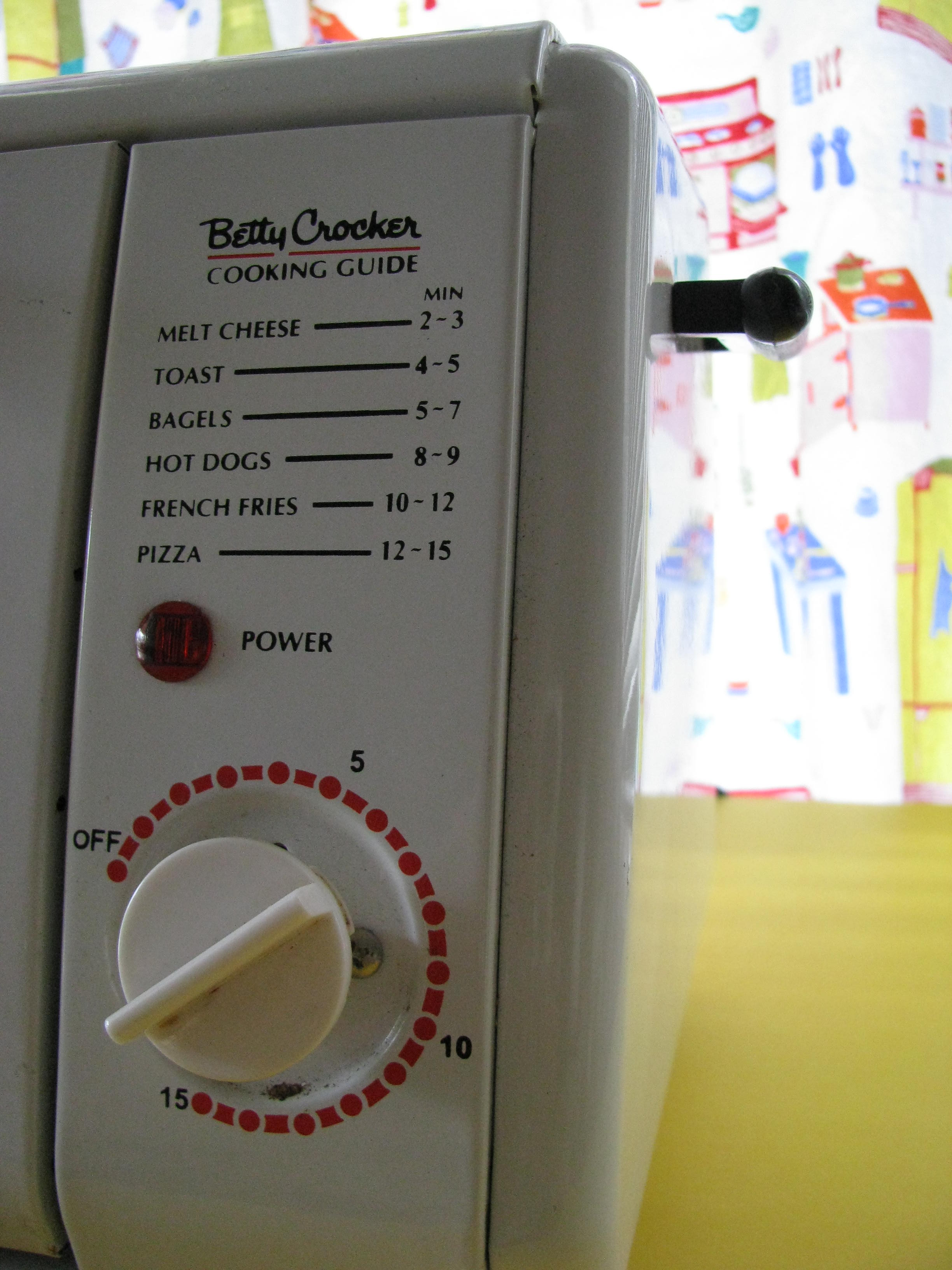 Isn't the cooking guide and the dial just the cutest?!! …and the handles are reminiscent of old pots. I don't have a clue how old this model is, so I'm going to pretend that it is from the 1950s or 60s. I don't know if toaster ovens even existed during that era, but no matter. It makes no difference if it was manufactured 5 years ago. It has a retro look that hooked me immediately and the $5.00 price tag sealed the deal.