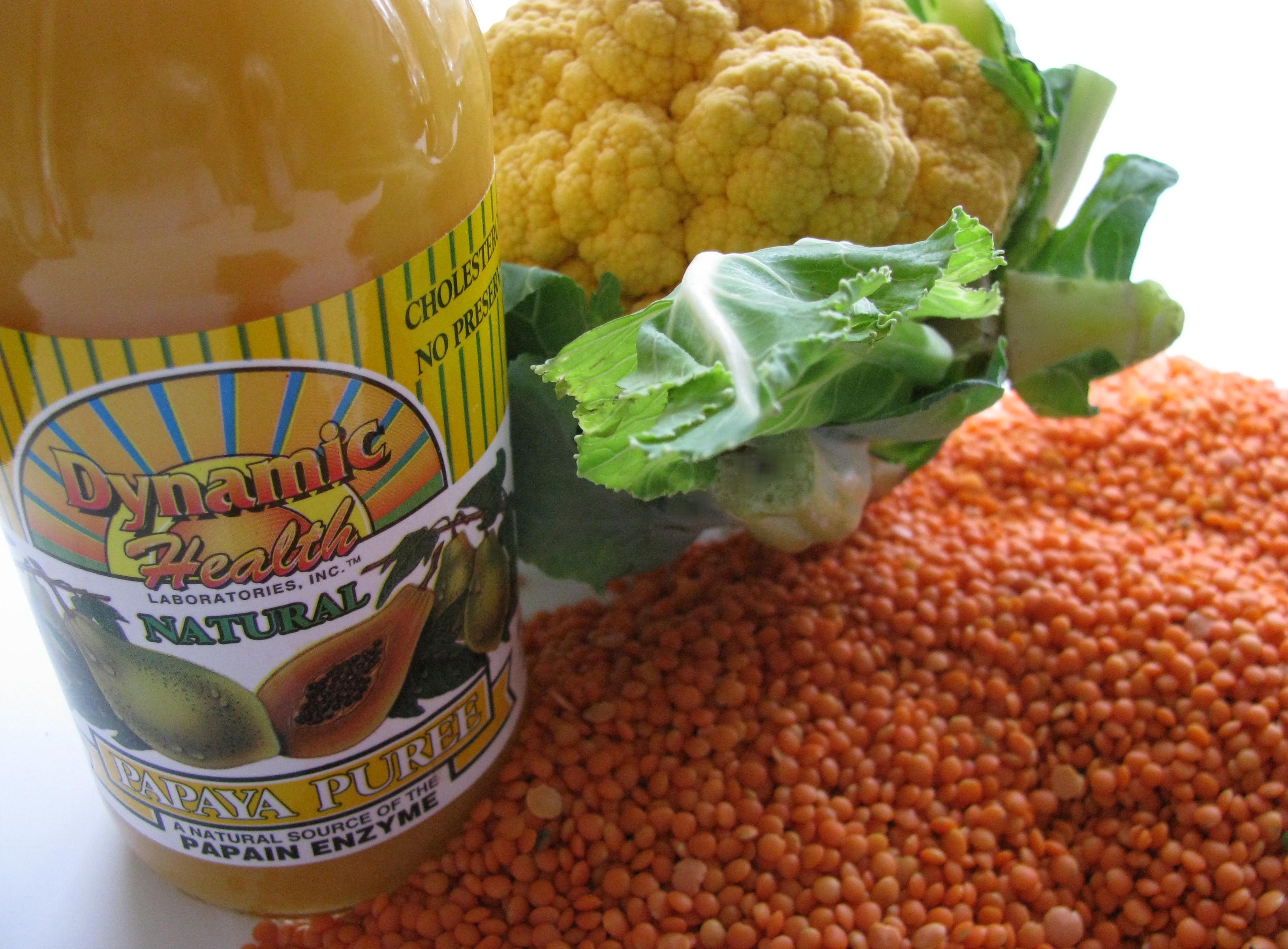 I bought two bottles of the papaya puree and have been adding a bit to our glass of water. It doesn't add a sweet taste, but it does supply tons of nutrition. I ran across a recipe for Red Lentils with Cauliflower and Potatoes… how perfect for what I have on hand, so I guess that seals my decision about what to prepare for tonight's supper.
