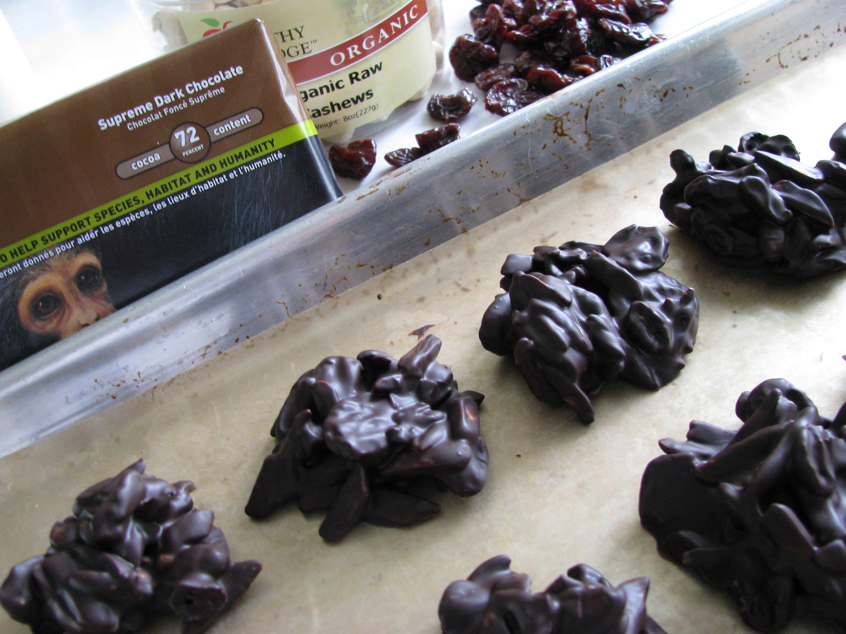 In a medium bowl, toss together the almonds and cherries (or cranberries). Line a baking sheet with waxed paper. (I used unbleached parchment paper.) Melt the chocolate in the top of a double boiler over slightly simmering water with the lowest possible heat, stirring frequently. Make sure the water isn’t touching the underside of the top pan. Remove the double boiler from the heat. Stir the fruit-nut mixture into the chocolate. Spoon out heaping tablespoon-size clusters of the chocolate onto the baking sheet about 1-inch apart. Put them in the refrigerator to set for about 15 minutes. Store and serve at room temperature.