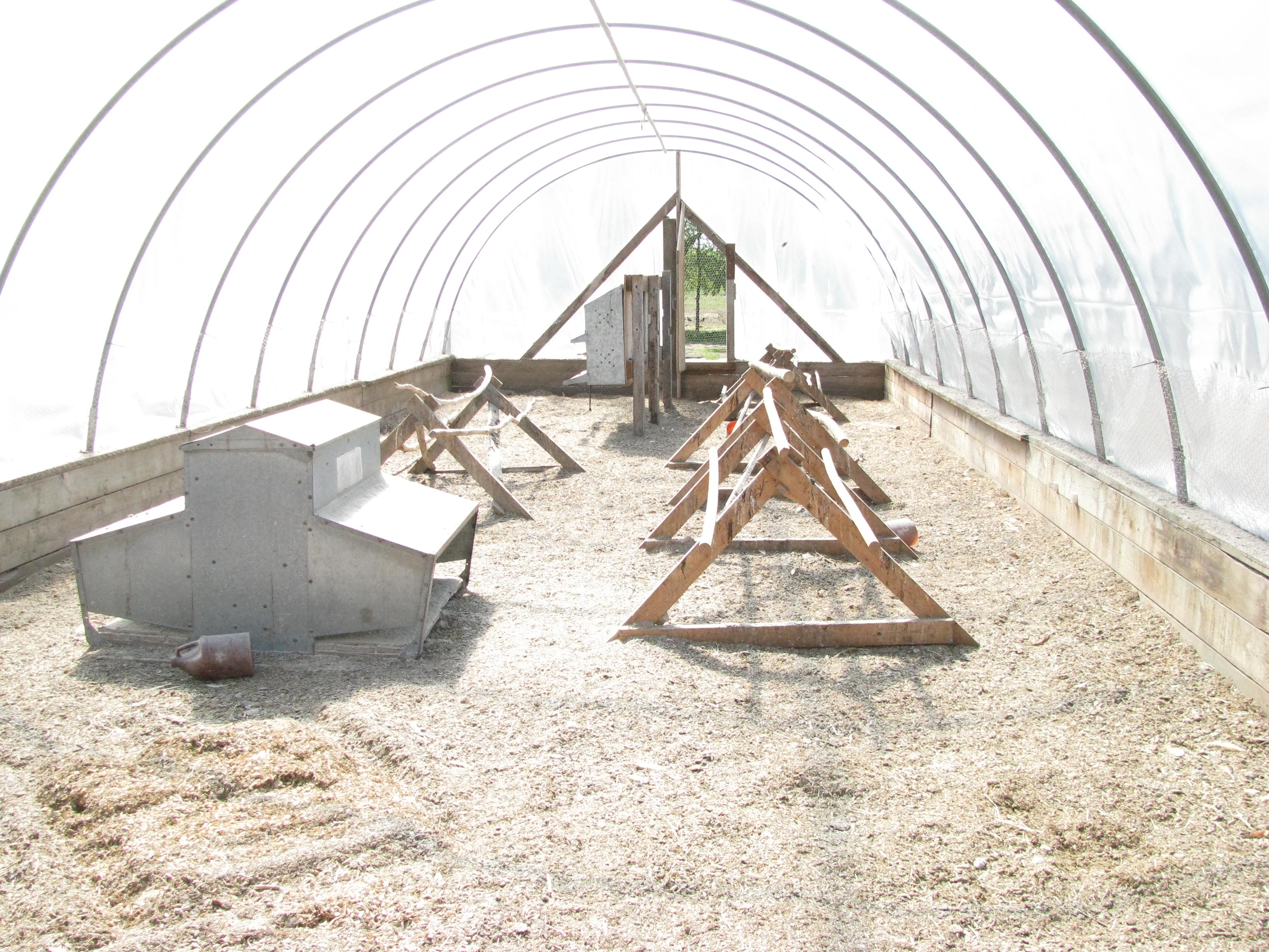 This is a photo of the chickens winter living quarters. It is a greenhouse so no artificial heat source is needed. You can see one set of nesting boxes near the door at the far end. There is another set near the door where I was standing to shoot the photo. Think about it… In the spring, when the chickens return to their portable coop, the structure could be used as a greenhouse to start garden plants. Does this make perfect sense or what?!