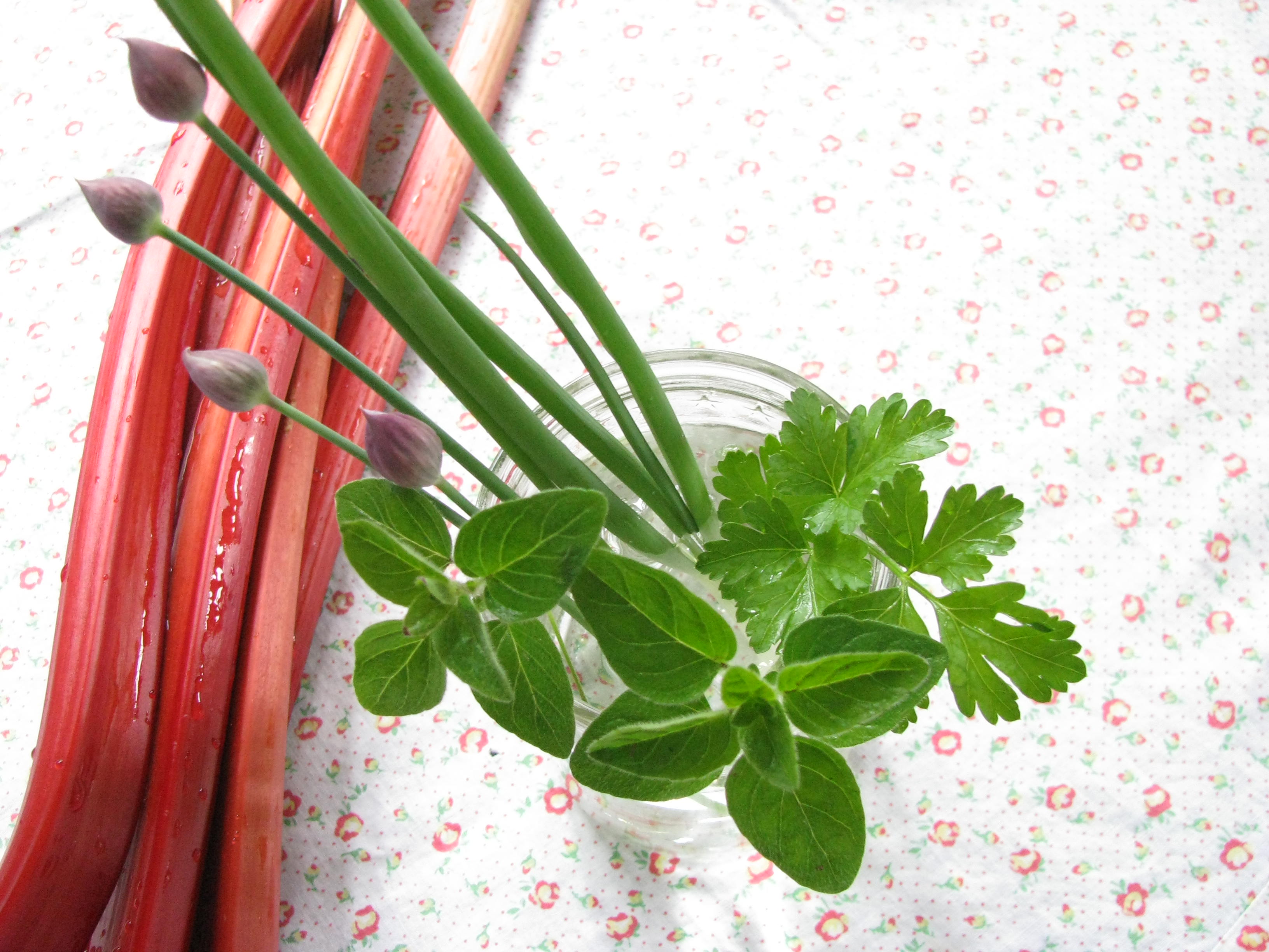 After I opened the coop door to let my hens out this morning, I strolled through my garden to see what fresh growth I could harvest for my breakfast menu. We received such a nice steady rain all day yesterday, so all vegetation glistened with water droplets and happiness and contentment exuded from every corner of the garden. I pulled several stalks of rhubarb to partner with strawberries for sauce with mint sprigs for garnish, green onions and flat-leaf parsley for an omelet, and some chives with blooms that hadn't burst open to add a pretty spot of color on each plate.