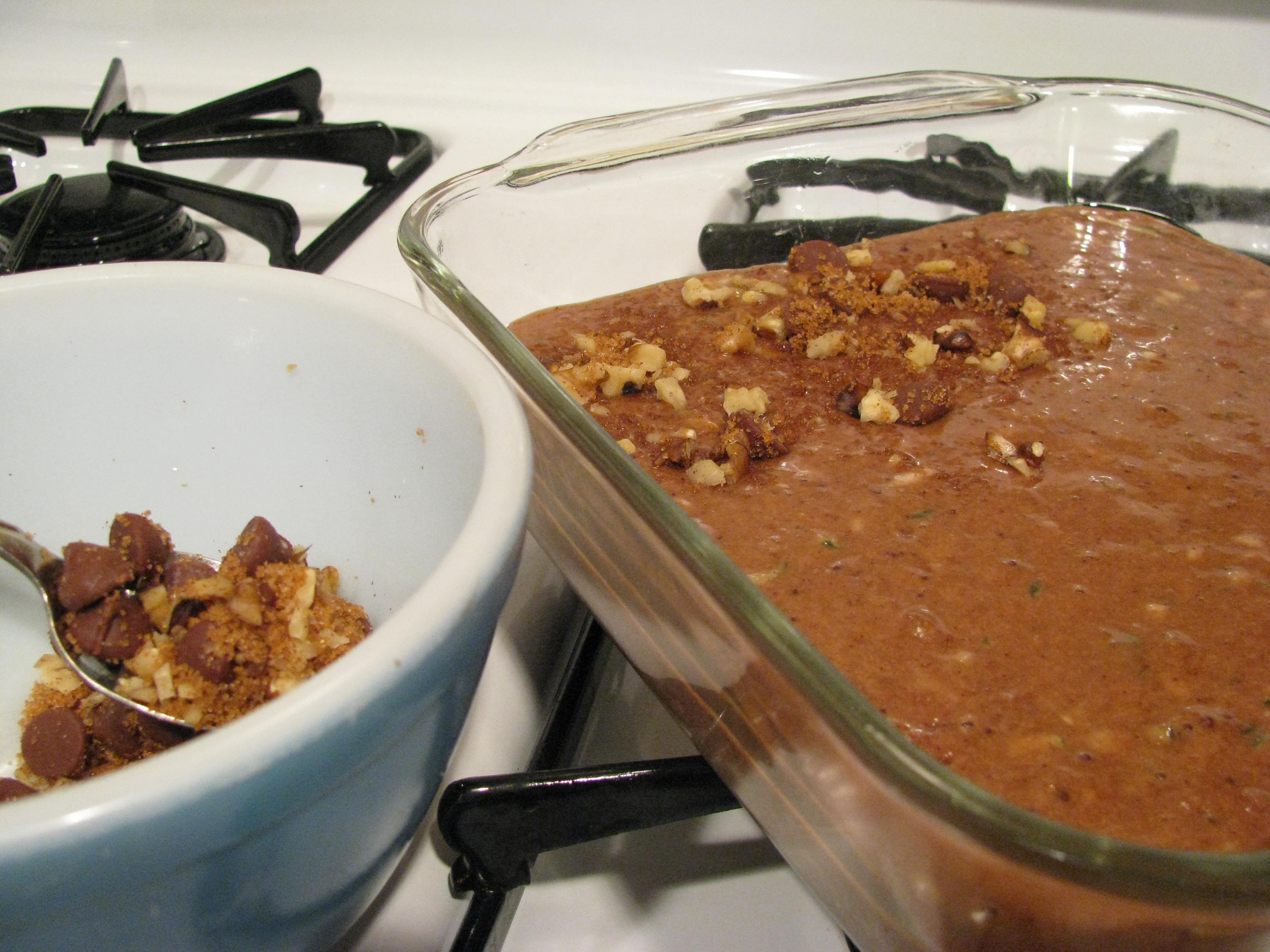 Beat oil, eggs, sugar, and vanilla. Mix in zucchini. Whisk dry ingredients together then add to wet and stir. Pour into 8X8-inch pan. Topping: Stir together 2 tbsp brown sugar, ½ tsp cinnamon ¼ cup chocolate chips, and ¼ cup chopped nuts. Sprinkle on top of batter. Bake at 350° for 50-60 minutes.