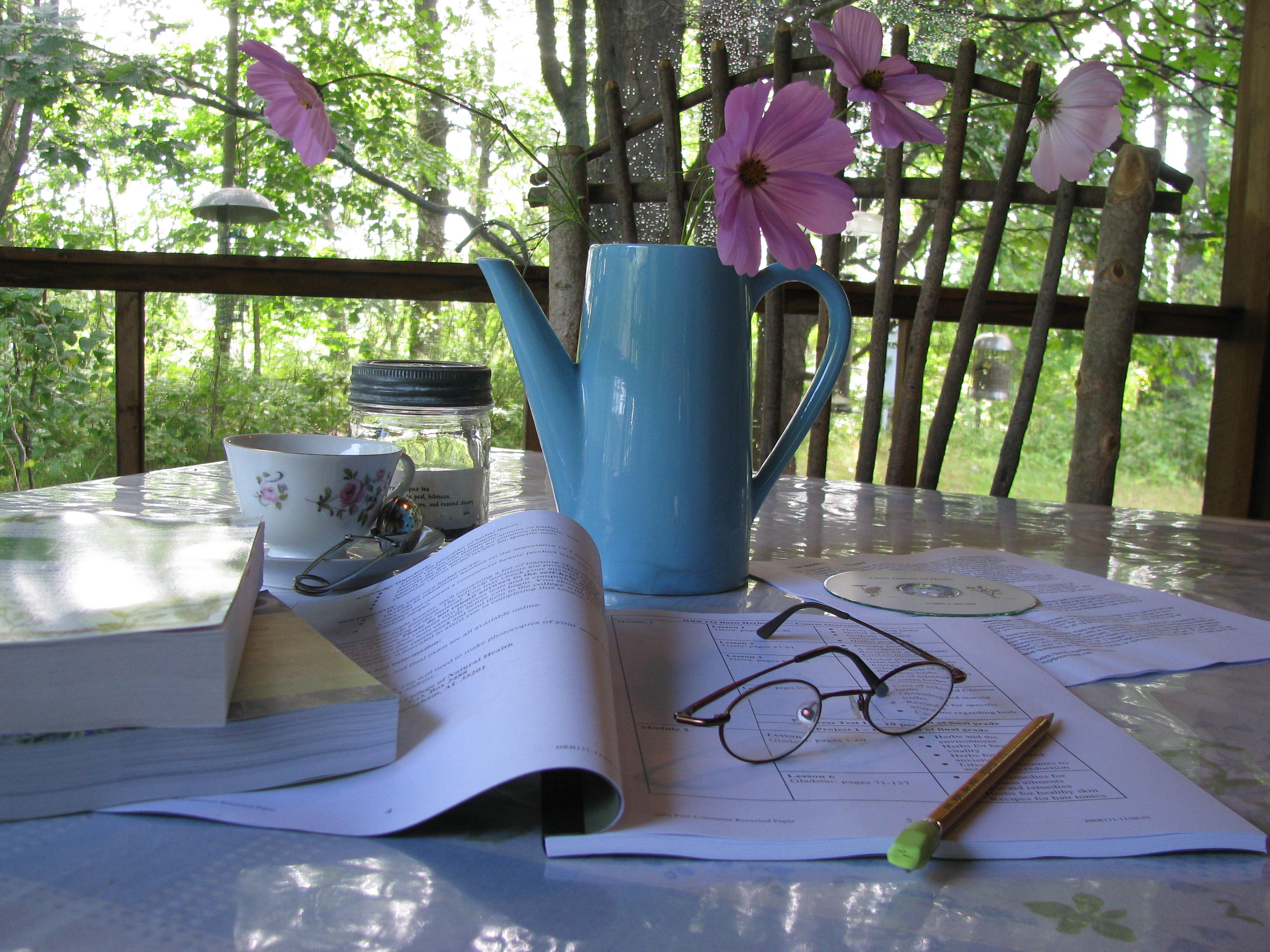 I have returned to the classroom… not as a teacher but as a student. A load of laundry is sloshing round and round in my front-loading washer, my dishwasher is so graciously cleaning my dishes for me, and my bread machine is kneading and providing a perfectly controlled temperature for my honey whole wheat bread's first rise so that I can then place it in a bread pan for its second rise before inserting in the oven. I picked a bouquet of cosmos from my garden and prepared a steaming cup of herbal orange spice tea (rosehips, orange peel, hibiscus, blackberry leaf, cloves, and roasted chicory) in my Grandma Grace's teacup. The birds feeding just off my backporch are supplying the most lovely melodies… no need for a nature CD. This is my classroom.