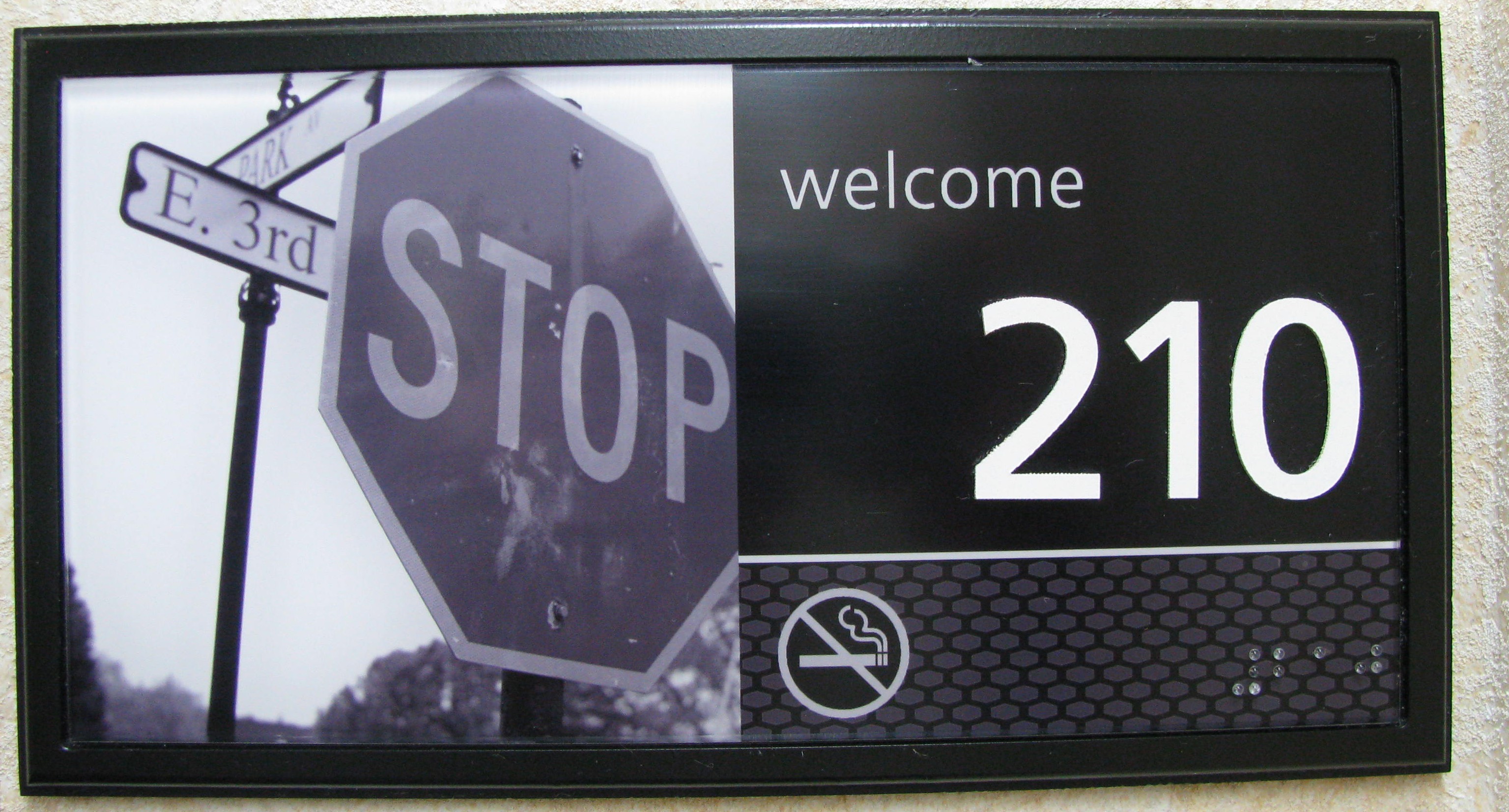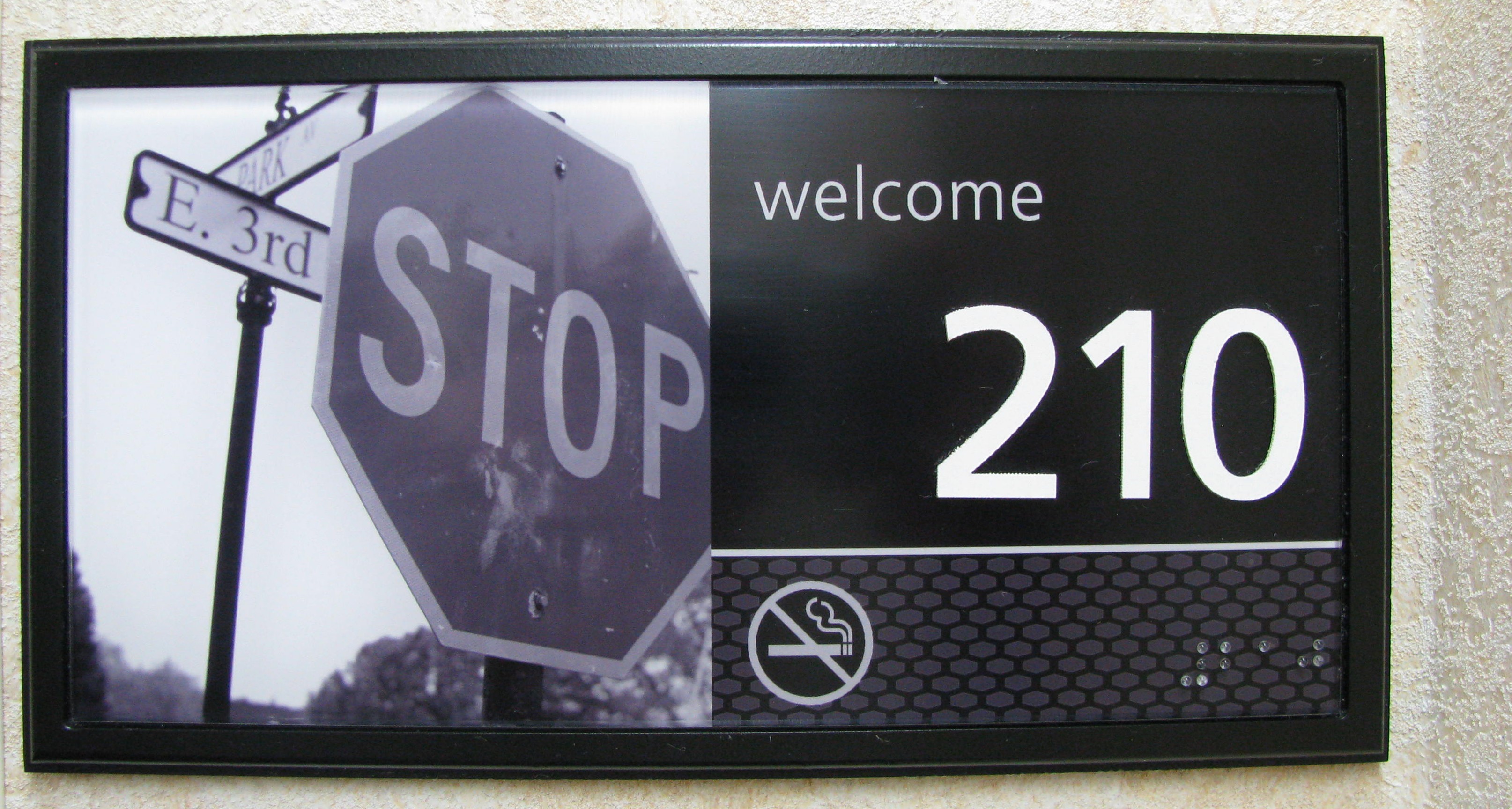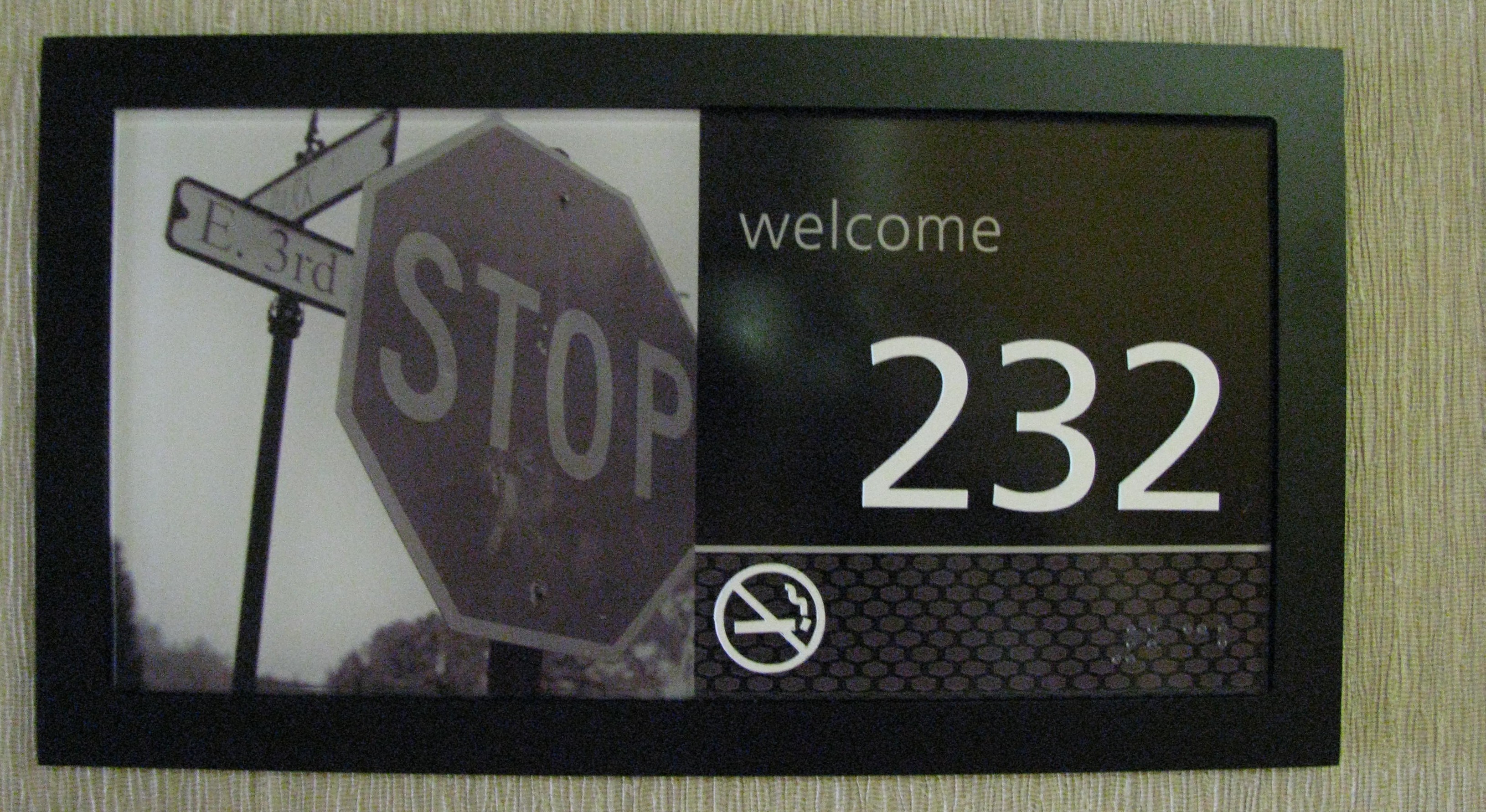 This is our room number. Coincidentally, the black and white stop sign is the same photo that identified our room last night at the Madison, Wisconsin Hampton Inn. You might not see that as strange, but there are approximately a dozen different photos that are used over and over throughout the hotel as room markers, so the chance of getting the same photo is rather slim. How appropriate, though… "Stop." That's just what we have done.