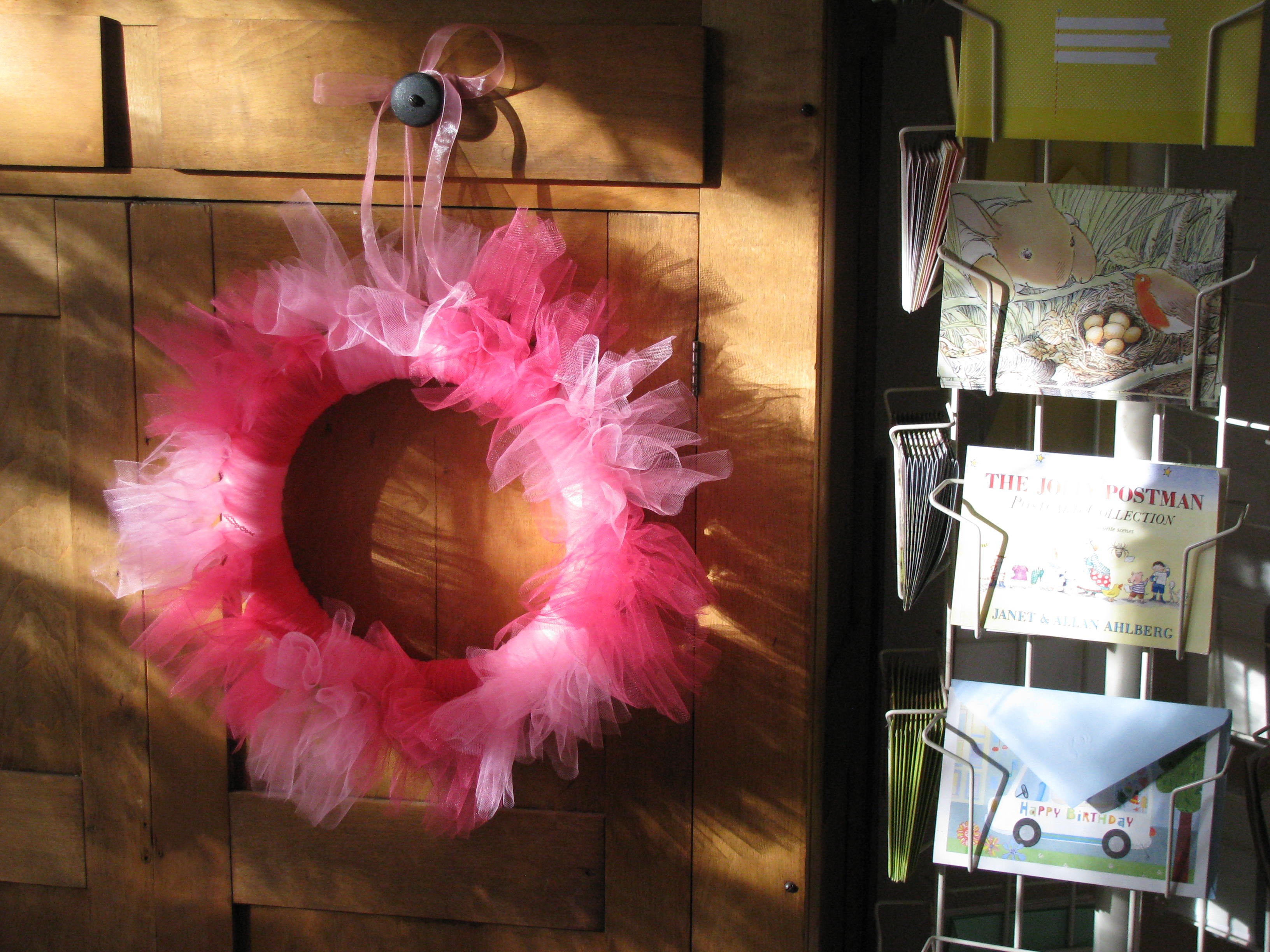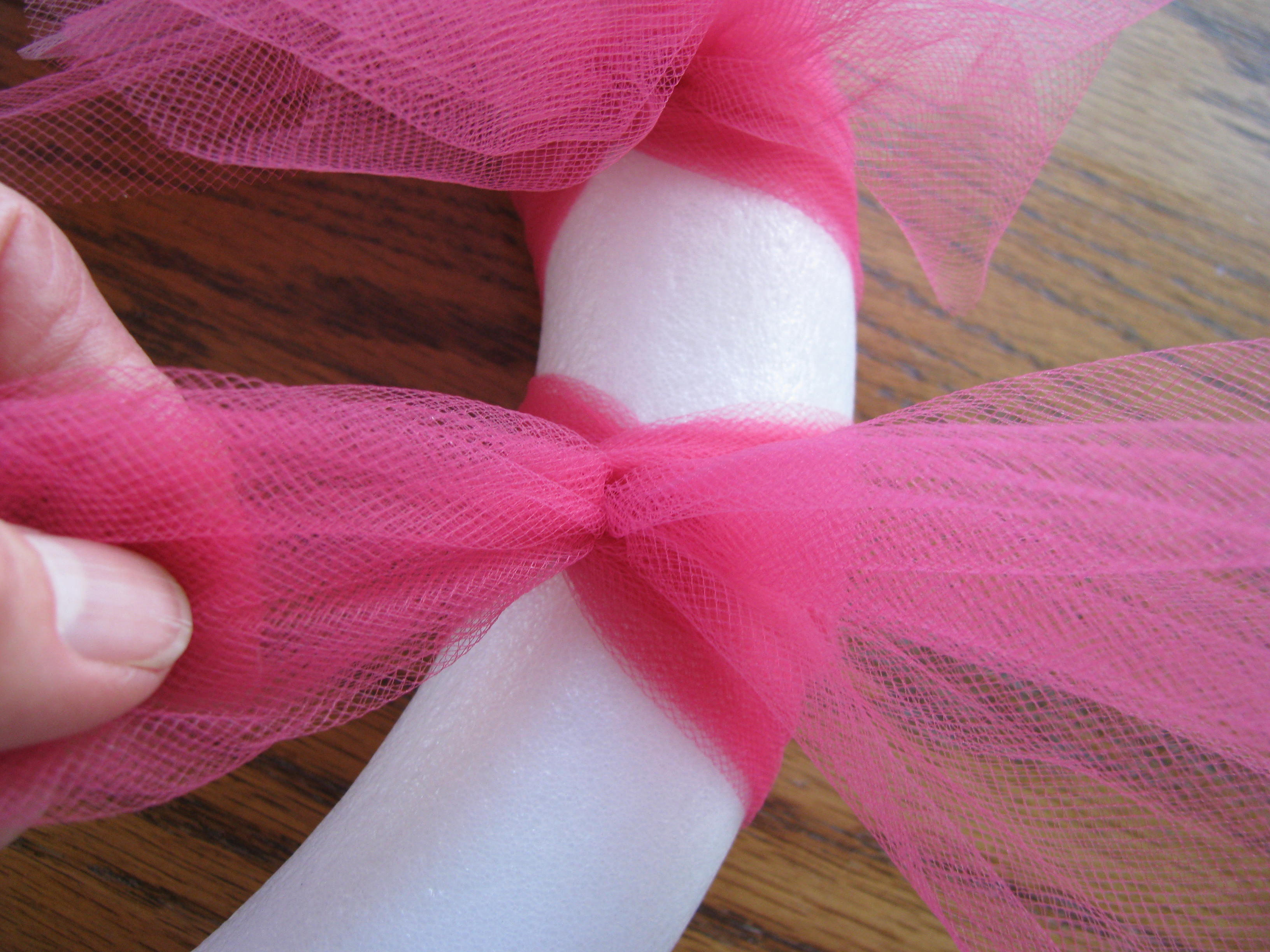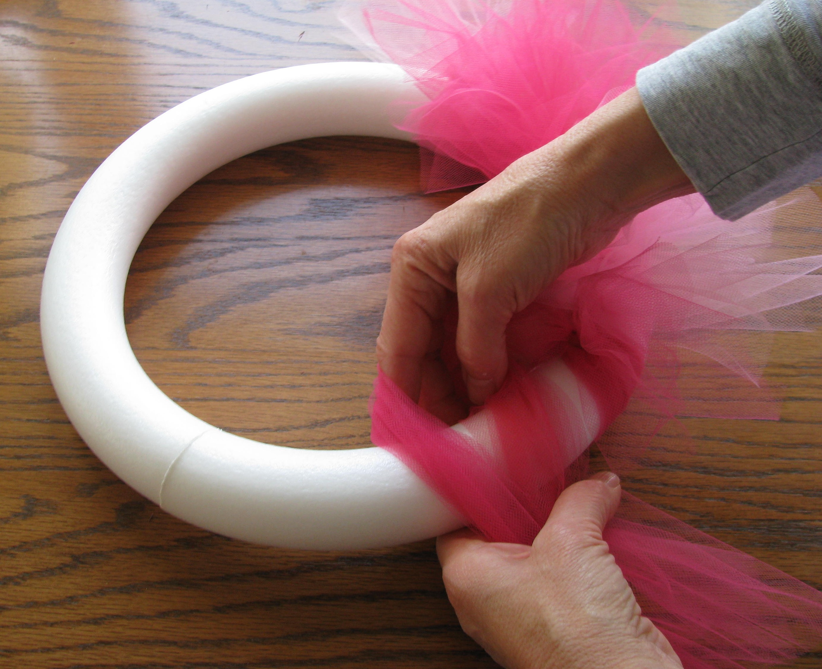 I am sure that you can devise your own way to make the wreath, but this is how I did it. You'll need a stryrofoam wreath form, 2 yards light pink tulle, and 2 yards dark pink tulle. The tulle is 60 inches wide, so fold it into four sections (half then half again) then cut along the folds and you'll end up with four 15-inch strips. Take each 2-yard long strip and fold it in half then half again. Cut on the folds and you'll end up with four 18-inch pieces. Weighting the tulle down keeps it from slipping while you cut it. Repeat with the other three strips. Do the same with the second color.  Take one strip folded in half and loop it over the styrofoam wreath form.