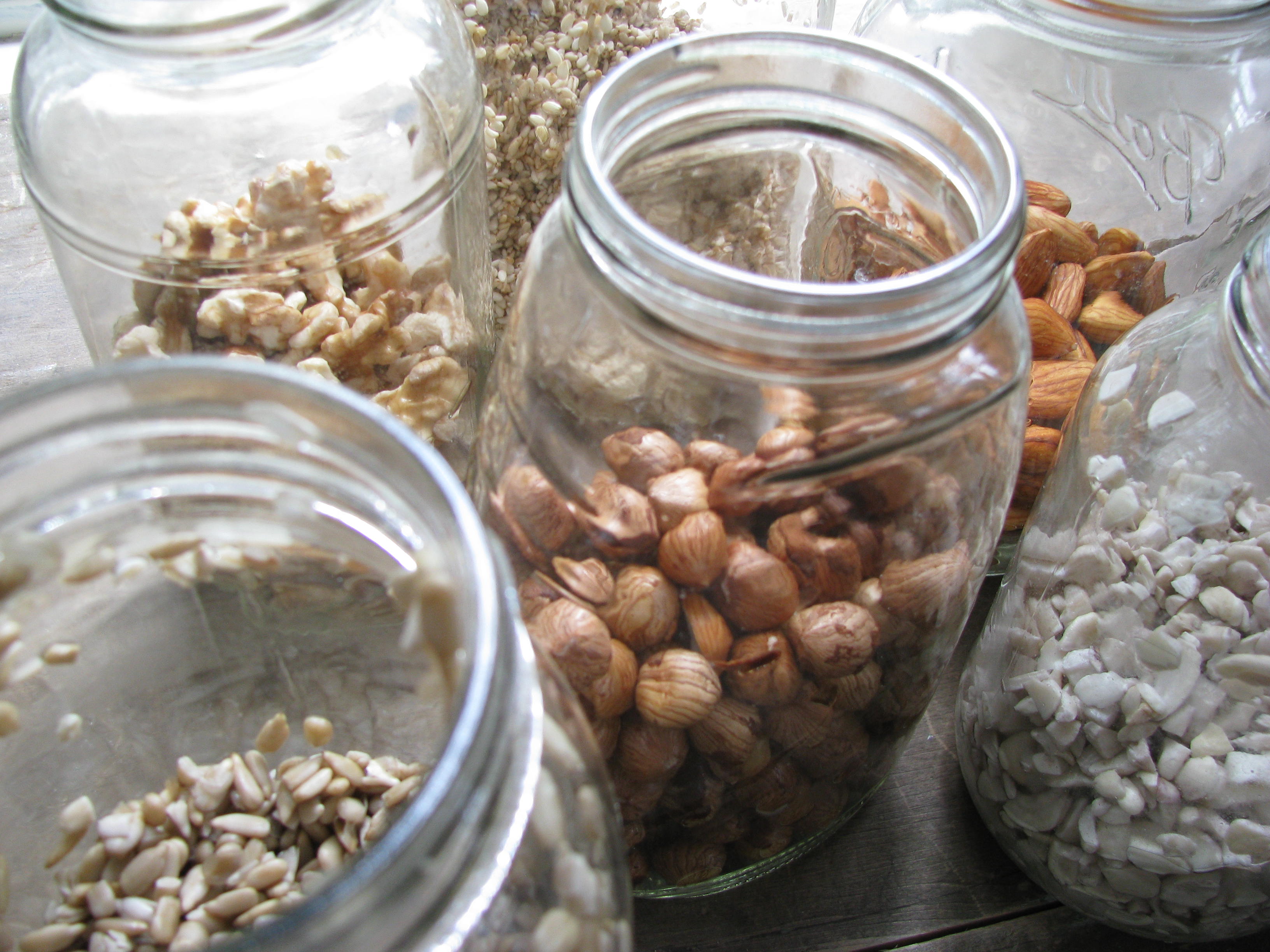 While I was at it, why not make several kinds of nut and seed milks? So, I soaked 1 cup each of walnuts, almonds, cashews, hazelnuts (aka filberts), raw sunnies, and sesame seeds in water overnight (enough to cover + a little more to allow room for swelling). In the morning, I drained and discarded the soak water (or you can use it to water your plants), then rinsed the nuts and seeds several times.