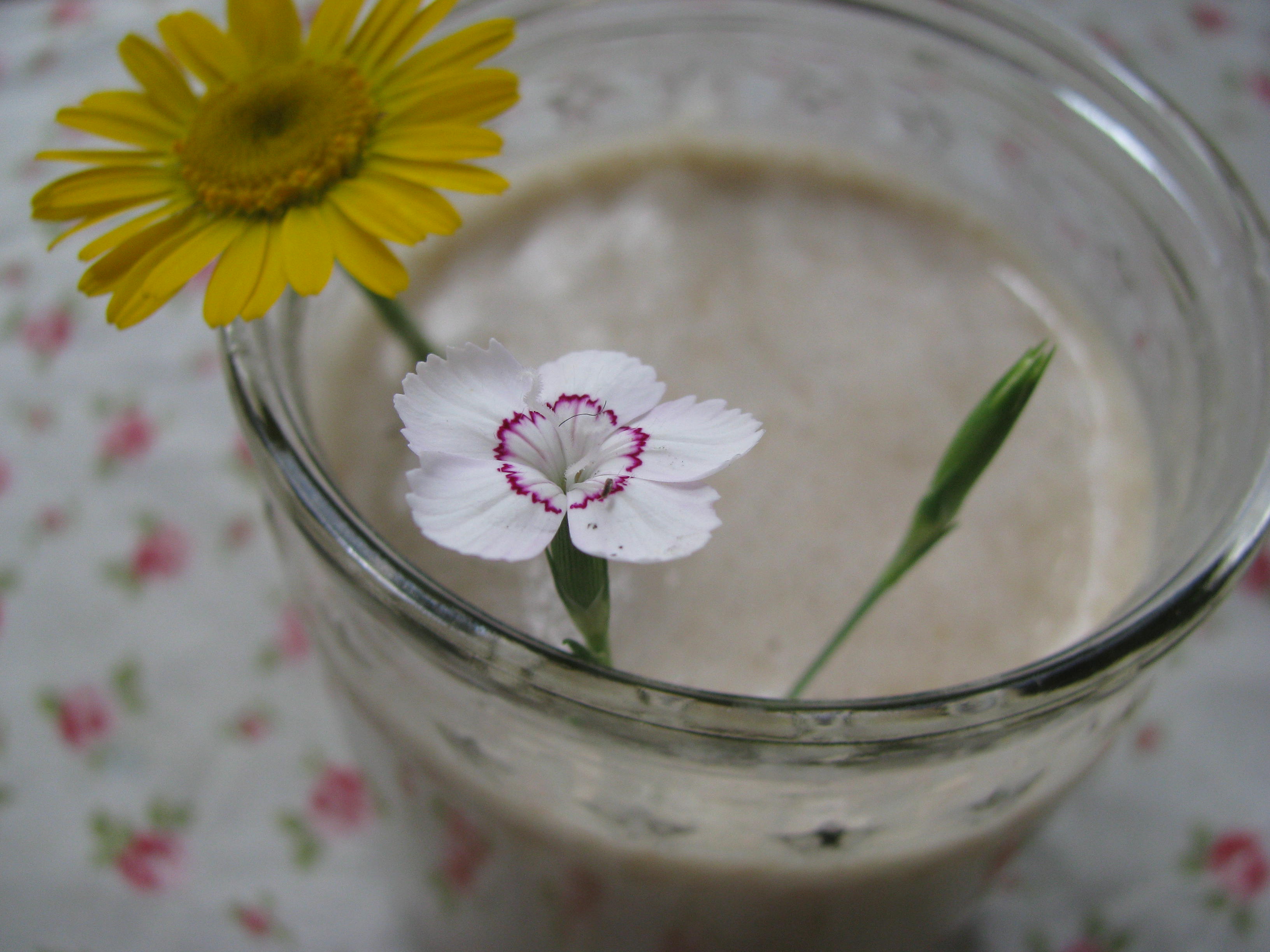 Ooooooooh… this drink made with homemade walnut milk is so very good! Two dainty flowers, plucked from my front porch stepping stone walkway to provide a pop of color, is all it needed. I have been reading Rawsome! by Brigitte Mars and have been hanging out in her recipe section for a while, building my repertoire of raw recipes.