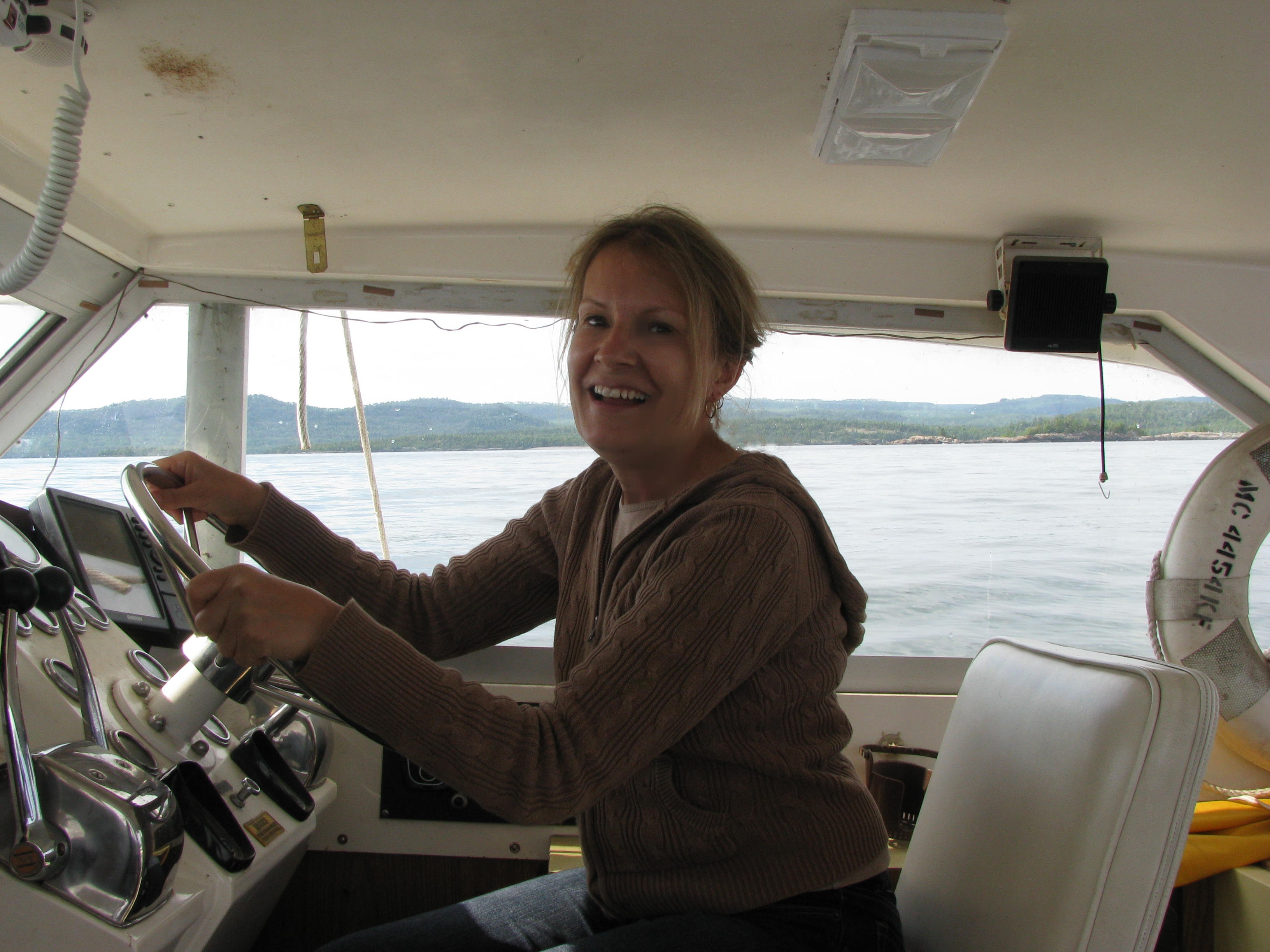 One thing that I wanted to do when I grew up was to visit the farthest point in northeast Minnesota where the state comes to a point. That is just what Dick and I did on our North Shore trip. We travelled north of Grand Portage to Hat Point Marina where Dick's friend, Elmer, has a charter fishing boat moored. Elmer took us out on Lake Superior and I drove the boat! Well… I sat behind the wheel and I was, for a moment, a fishing boat captain.