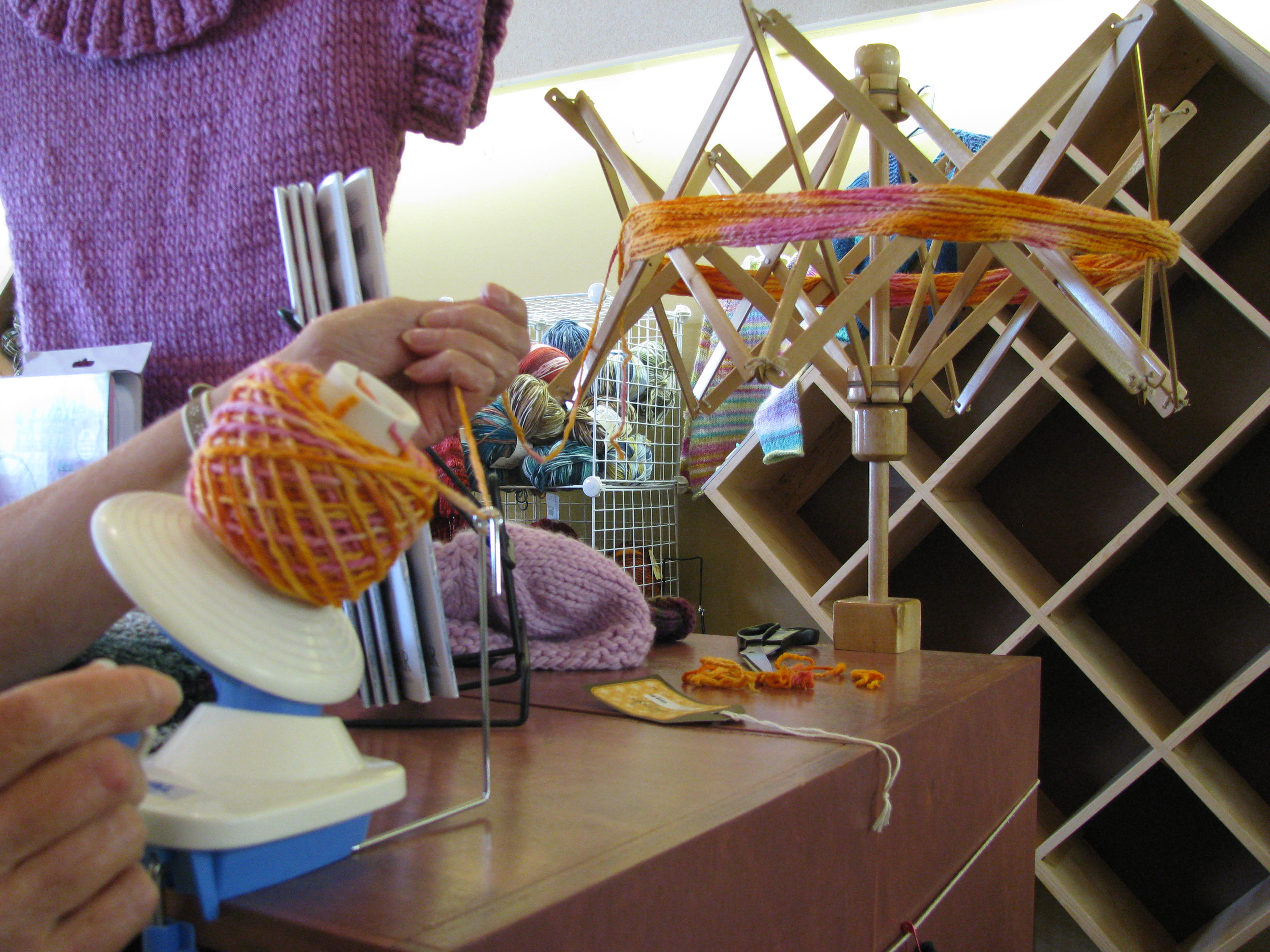 It's easy to pull the end of yarn from the outside or center of a ball or skein of yarn, but a "hank" of yarn is twisted into a pretzel shape, and if you try to pull out a length of yarn it will get tangled. A hank must be rolled into a ball. After snipping the strings that hold the hank in its pretzel shape, the yarn can be held between someone's outstretched hands or it can be stretched over two chair backs, or… have the shop wind it for you by using two devices that simultaneously work together to wrap the yarn into a ball. The umbrella-like device that holds the hank is called a "yarn swift." One hand holds the yarn strand while the other hand cranks a device that neatly wraps the yarn into a ball. The amazing things I have learned already…