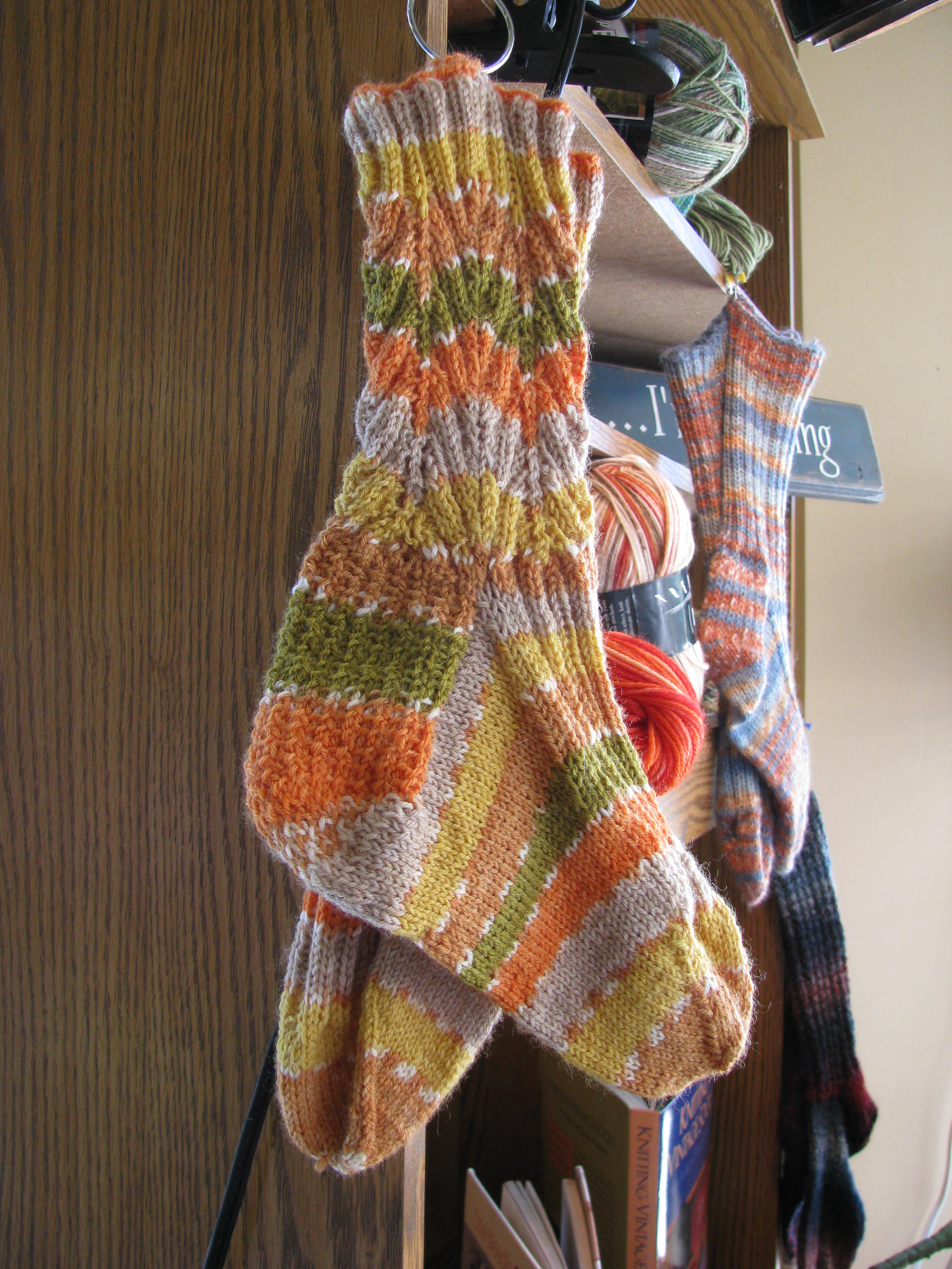 Jenn's sock and her contagious knitting passion… and these socks hanging in the shop's window are my reasons for wanting to learn to knit… and I shall.