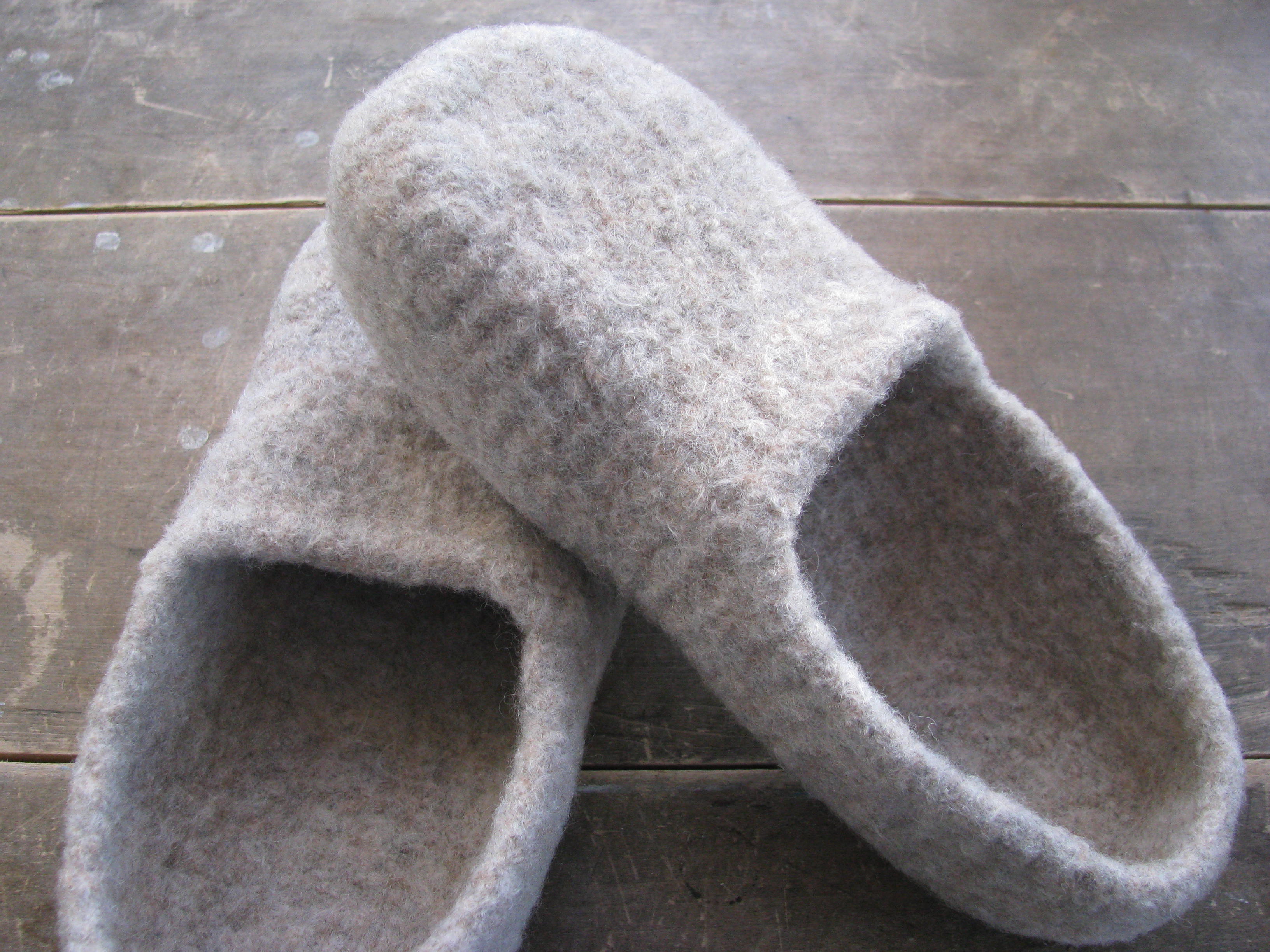 I received these handmade felted wool shoes from my daughter Heather for my birthday. They are keeping my tootsies warm as I type this post. They are so so comfy and the timing is perfect as these October nights have cooled considerably… down to 39 degrees overnight. It's difficult to see in the photo, but there is vertical rib stitch around the shoe's perimeter. I love them immensely. You can get a pair, too. http://www.etsy.com/shop/quiltery I wear mine everyday all day long when I am indoors. When I need to wash them and wait for them to dry (they air dry fast), I miss them so very much. They are perfect in every way.