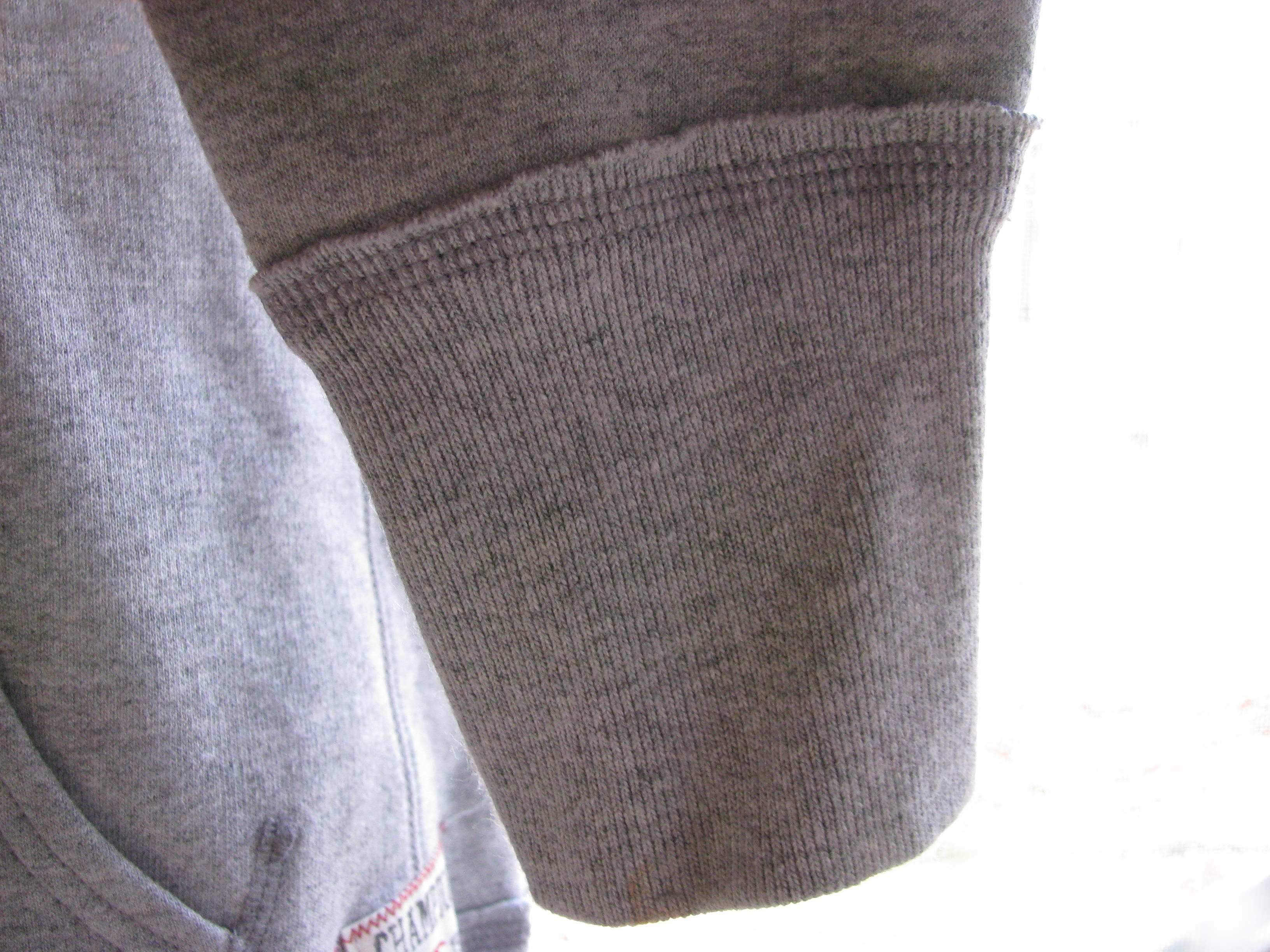 It is an oxford gray Champion Sweatshirt that has extra little details… a raw edged cuff stitched on top of the sleeve, rather than a finished seam, which gives it a handsewn look.