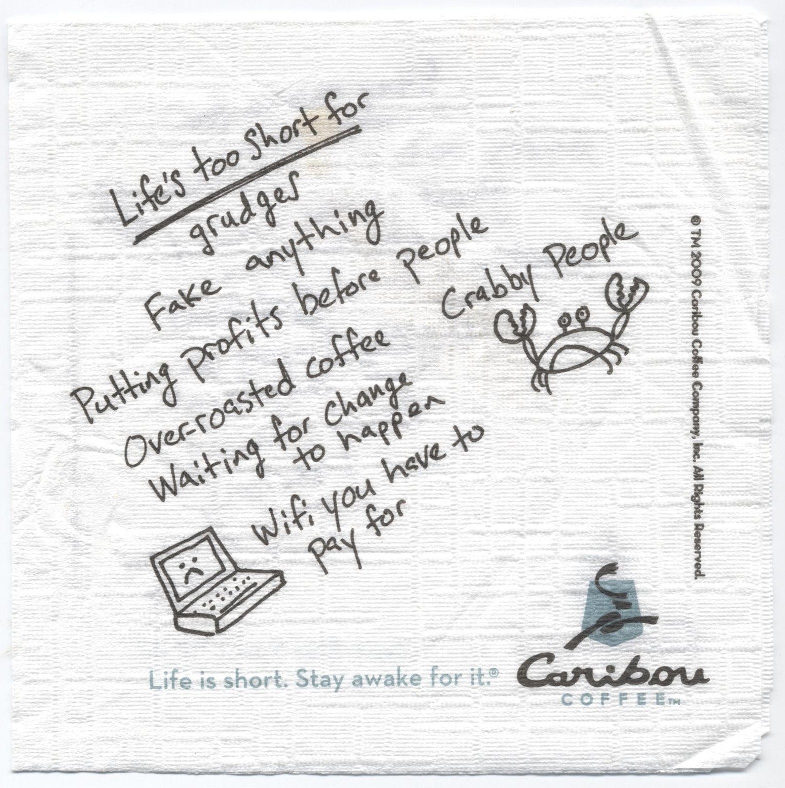 When Dick and I stopped by Caribou Coffee for a hot chocolate recently, I tucked the napkin into my backpack… the messages imprinted on it were worth revisiting again.
