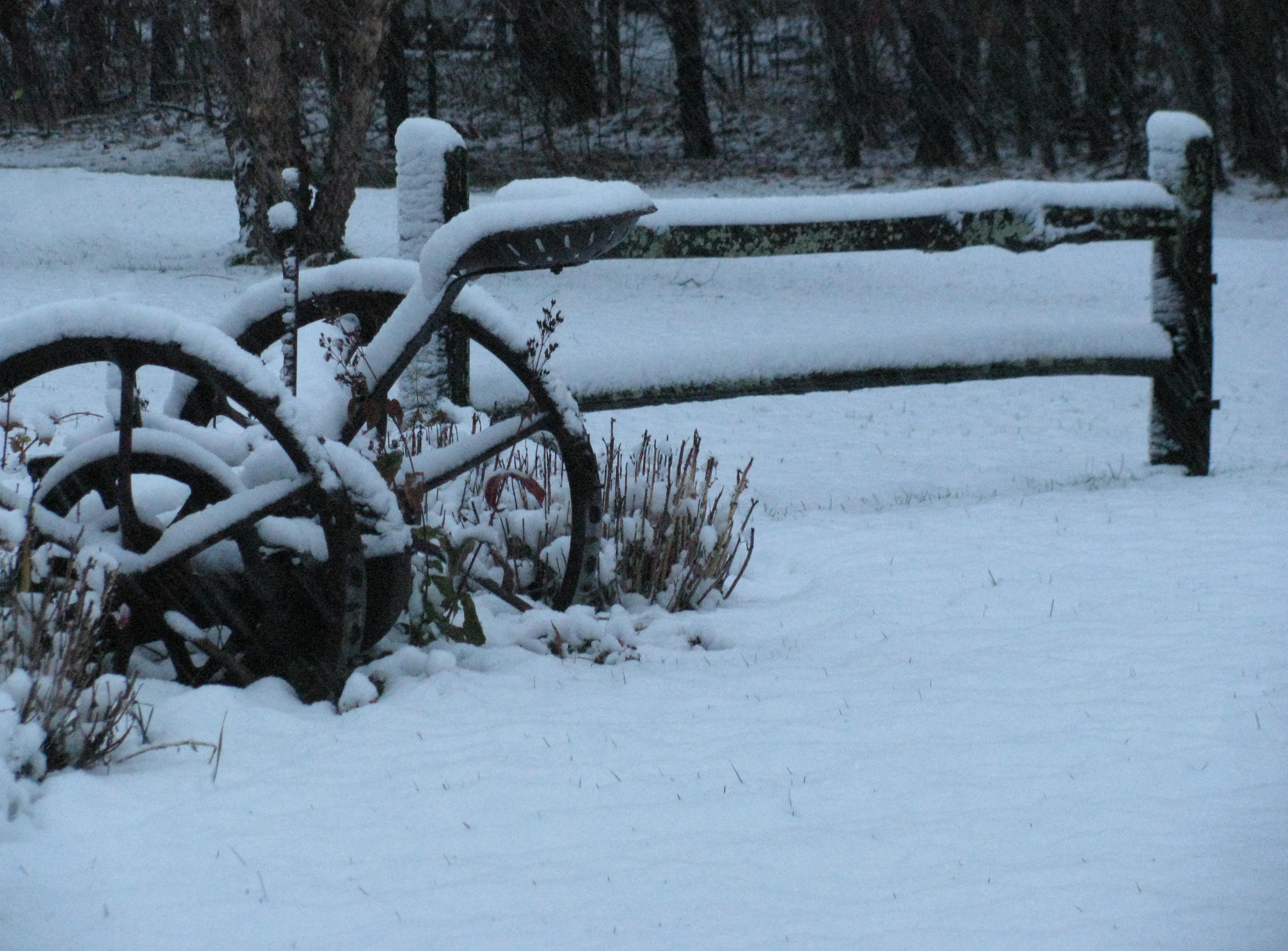 This was the view in our front yard a bit shy of 8:00 this morning before it was completely light outside… our first snowfall of the season. The snow continues to silently flutter to the ground forming a blanket that has muffled virtually all sound. The silence… Can you hear it? Listen ever so quietly.