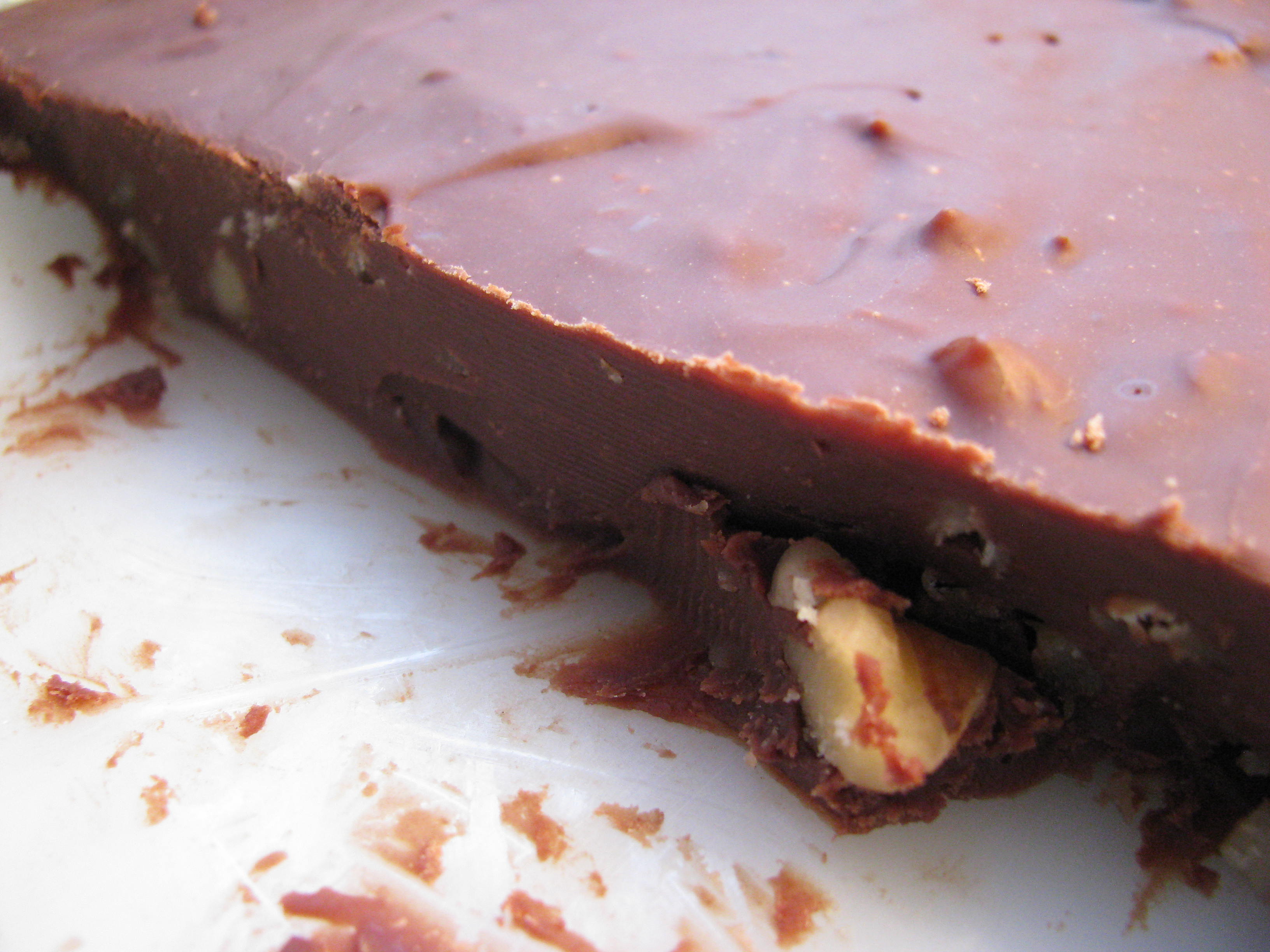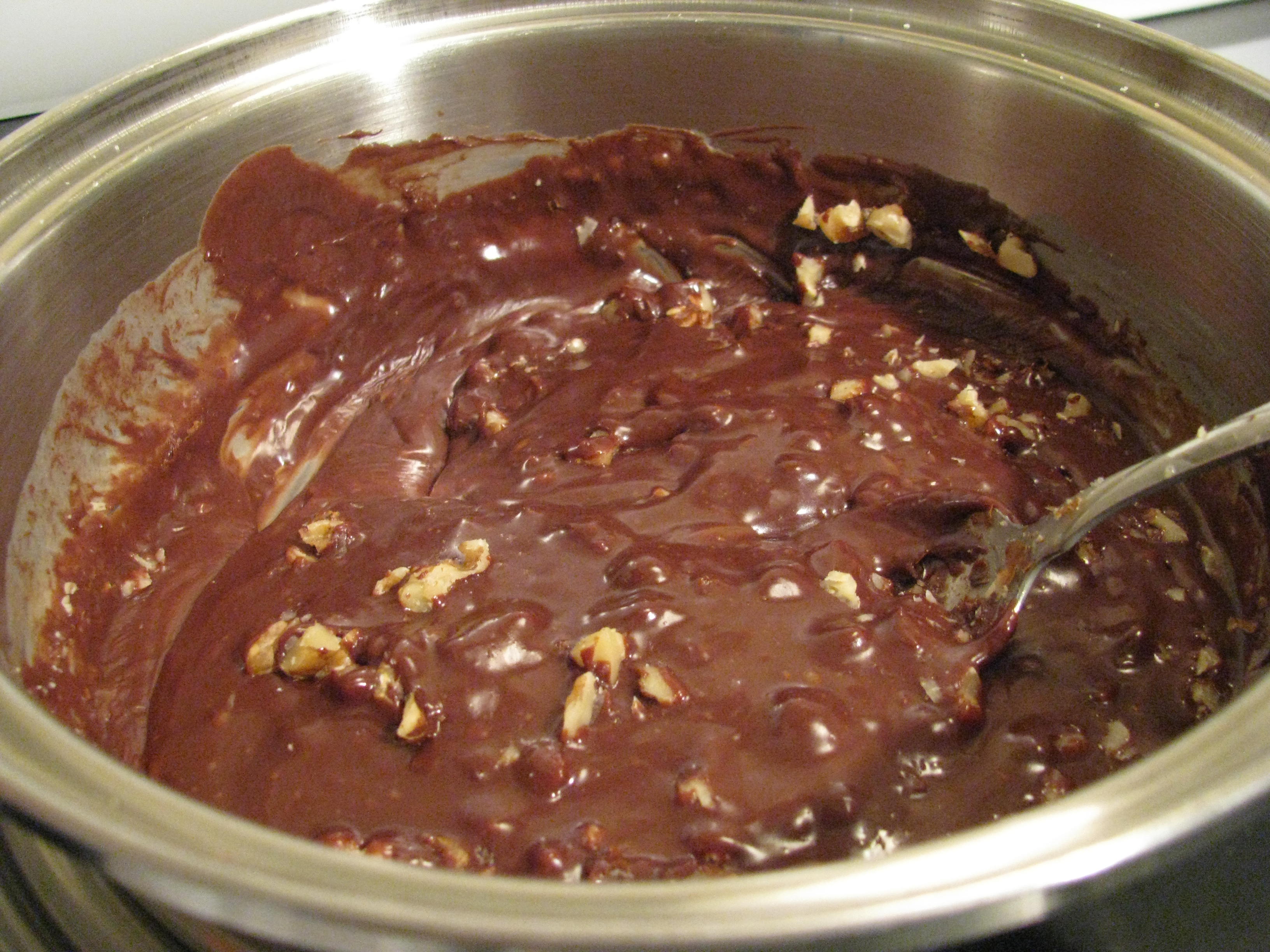 Mix together chocolate, condensed milk, and salt in a saucepan. (I used a double boiler.) Melt over low heat. Mix nuts into melted mixture. Pour into a buttered pan. Allow mixture to harden.