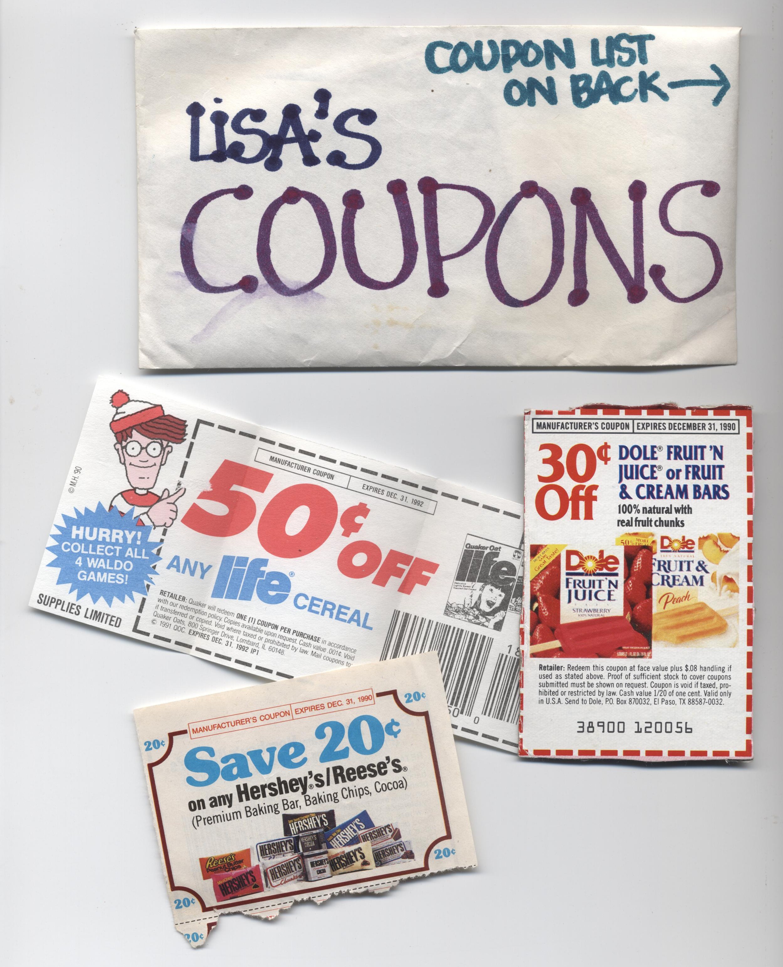 I was cleaning today and ran across three envelopes that carried me back twenty-five years or so. This is my daughter Lisa's envelope with some of the coupons that were tucked inside.