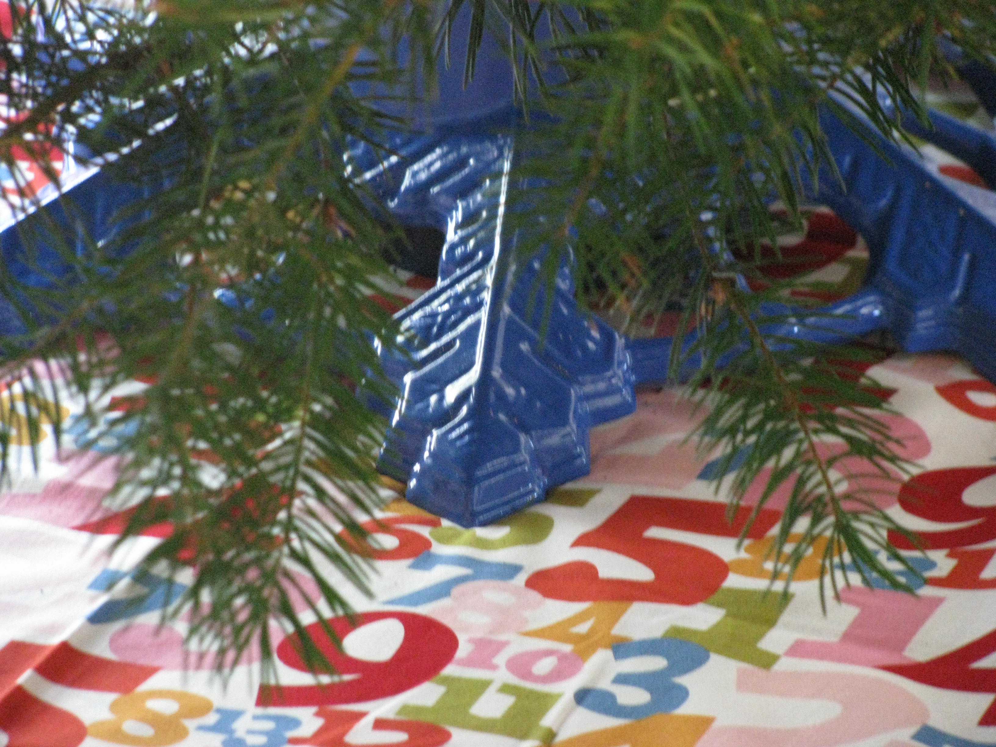 To simplify Christmas gift giving, my three daughters, their spouses, Dick, and I draw names. When we were visiting them in NY and NJ over Thanksgiving, we exchanged gifts. Heather had my name. One of her gifts to me was the most adorable cast iron tree stand molded into a snowflake form. To coordinate with some fun fabric Jessie had given me a few years ago, I spray painted the tree stand a cheery blue.