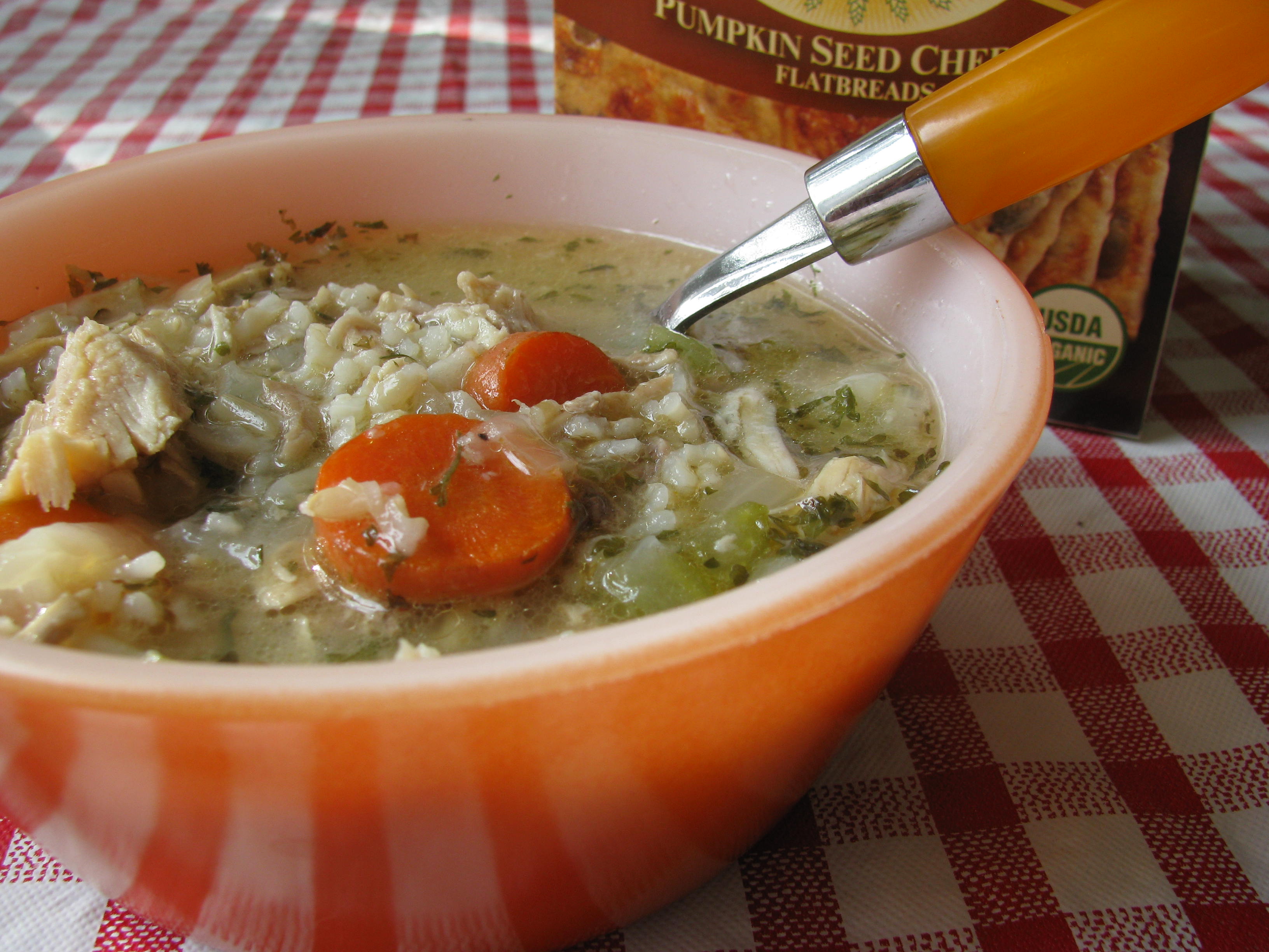 Hosting Christmas dinner reaps the benefit of leftovers. To eek out the last bit of meat from a roasted turkey, a big pot of soup is a shoo in. This basic recipe, from bestcrockpotrecipes.net, does not require homemade stock. Just toss a few ingredients into your crockpot or, as I chose to do instead, let it simmer in a soup pot on top of the stove just long enough for the brown rice to soften… fast, flavorful, a perfect winter day warmup.