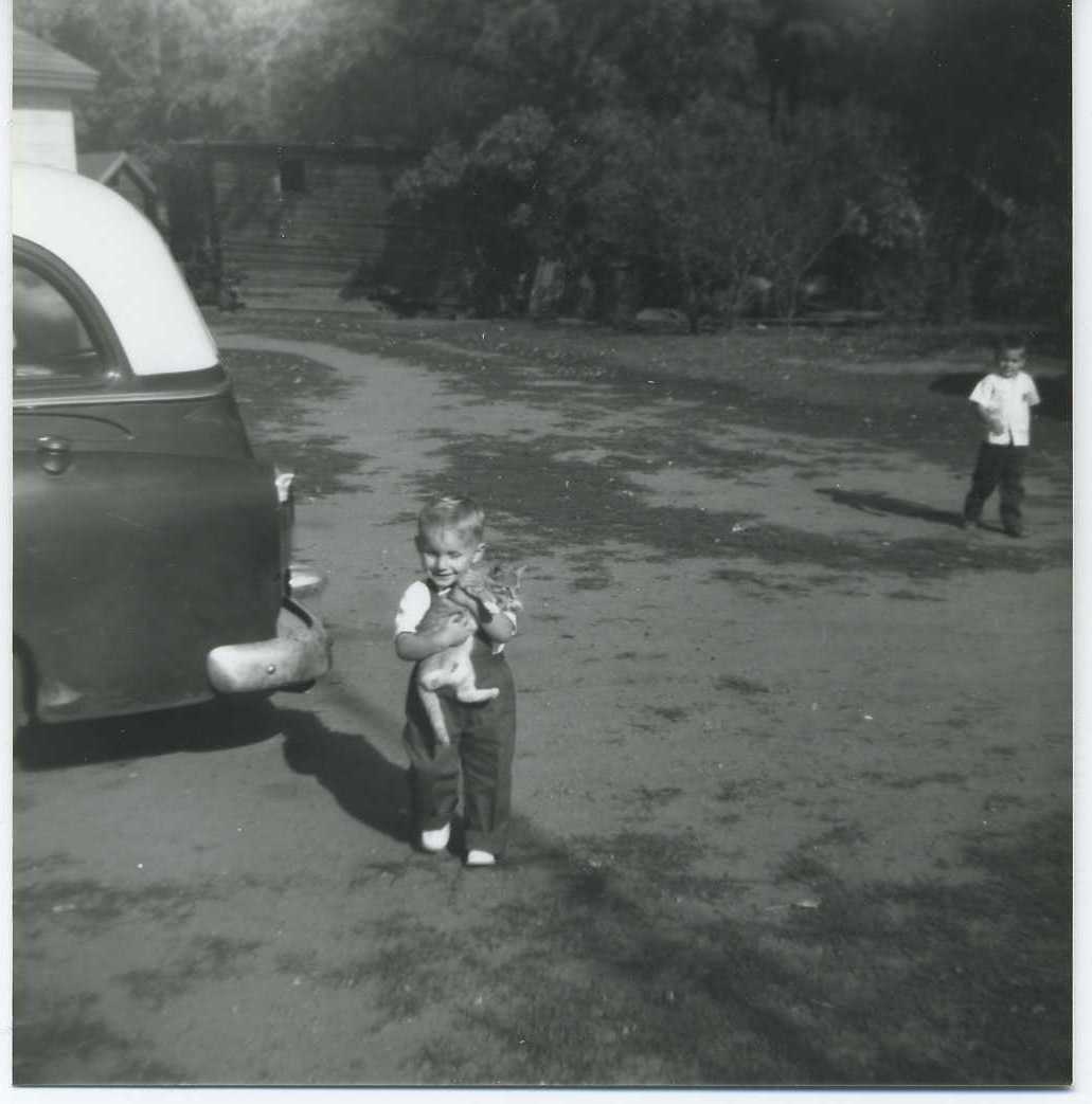 Below is a photo of the back end of grandpa's 1954 Chevrolet Handyman Station Wagon that he used when I was about 9 or 10 years old. My brother Rick is holding a cat and my brother Ron is in the background. The photo was taken at the farm where I grew up 10 miles southeast of Brainerd. (Photos courtesy of my sister Marlene. Identification of car's make and model courtesy of my husband Dick.)