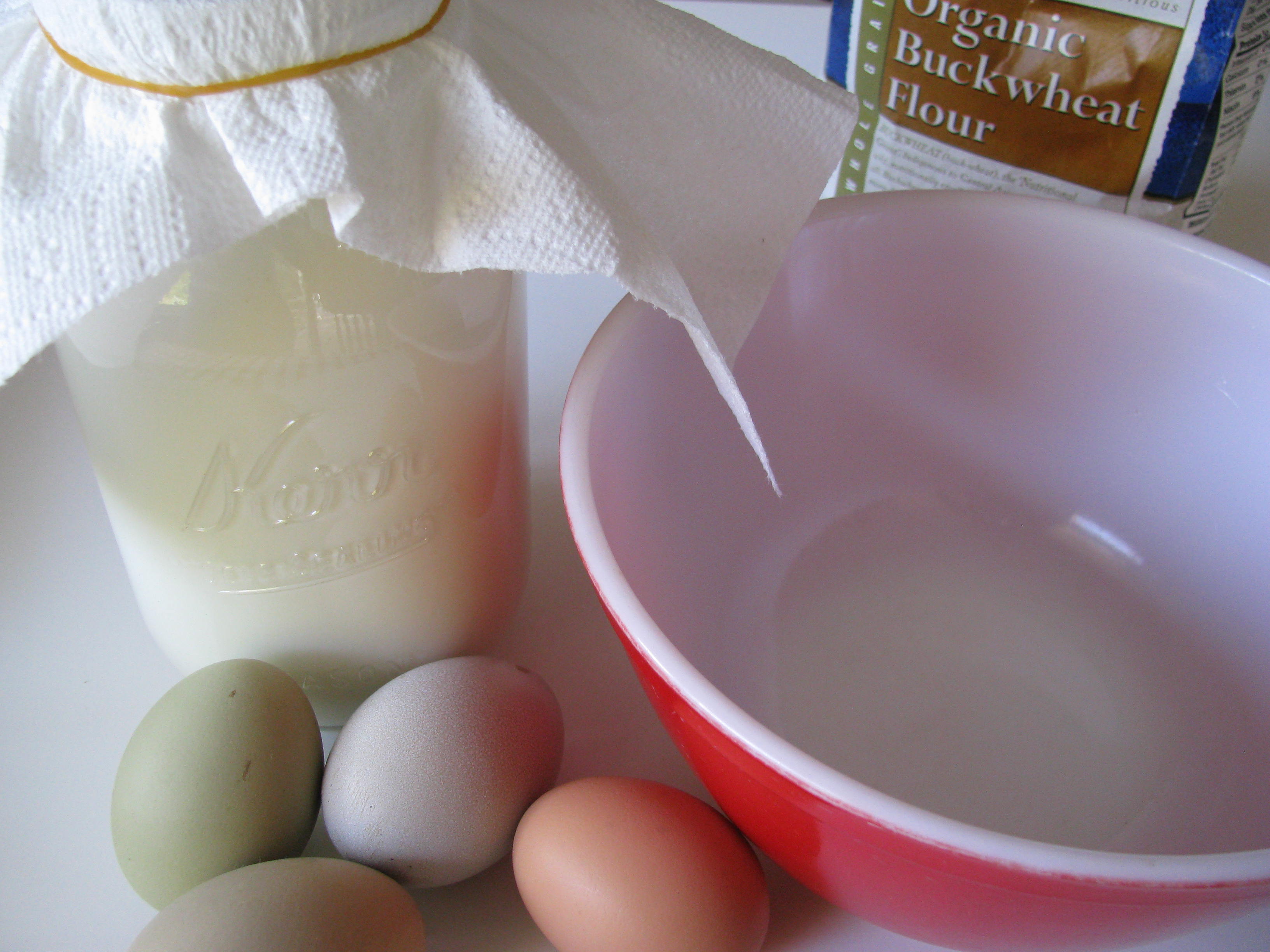 This week, I learned how to make sour cream and buttermilk. After a few minutes of thoughtful pondering, I pulled a Fluffy Buttermilk Pancake recipe from my file. Adapting it slightly by substituting buckwheat flour for part of the whole wheat pastry flour, I decided it would be a perfect use for my luscious, rich homemade buttermilk and colorful Araucana eggs that a neighbor had dropped off. The pancakes were lighter and more tender than ever before. It was the homemade buttermilk… I am sure of it!