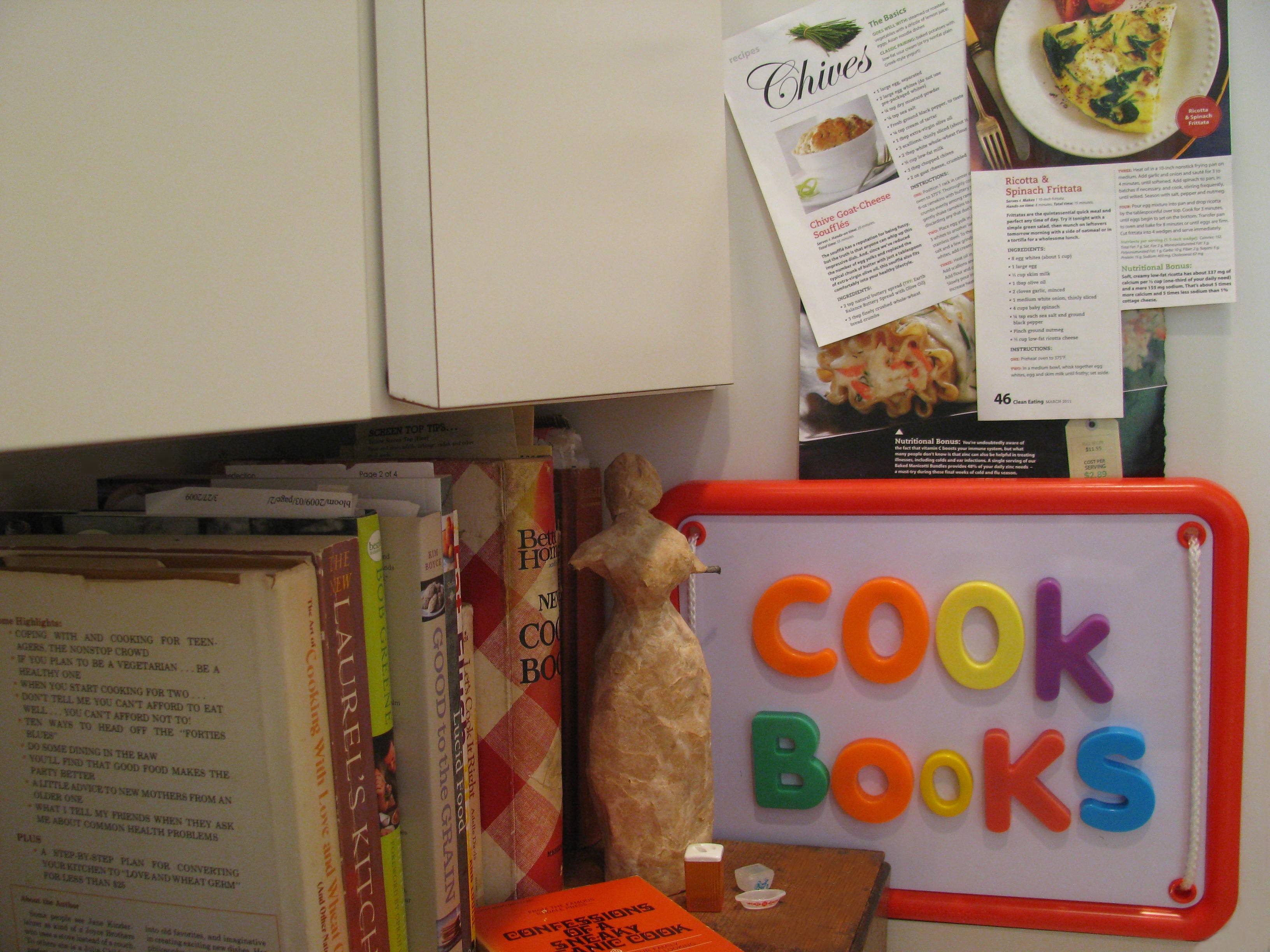 I displayed it by… what else… my coookbook collection. Above it, on the side of my pantry, I posted recipes that I plan to try in the future. I chose ones that use skills in upcoming lessons in my Cultured Dairy and Cheesemaking eCourse – Ricotta & Spinach Frittata (ricotta cheese), and Baked Manicotti Bundles (cream cheese and mozzarella)… recipes from my March 2011 Clean Eating Magazine, and Spinach and Ricotta Lasagna (ricotta cheese)… recipes from my March 2011 Real Simple Magazine. Because my mind is beginning to switch gears to spring, I also posted a Chive Goat-Cheese Souffles recipe to test and expand my seasonal (spring – chives) recipe collection.