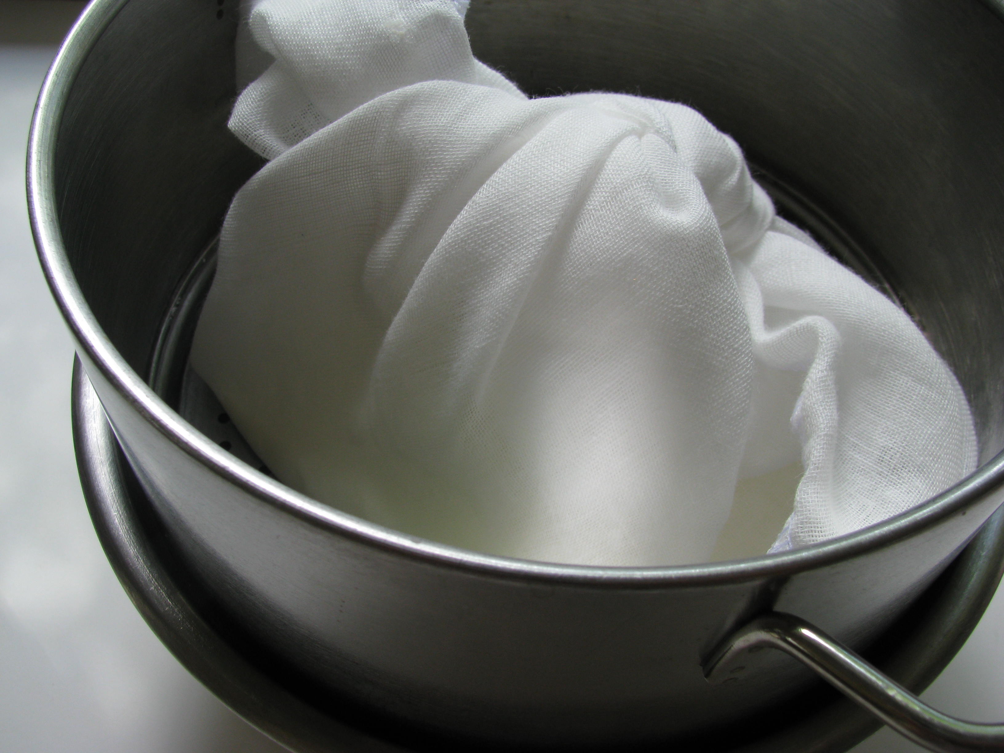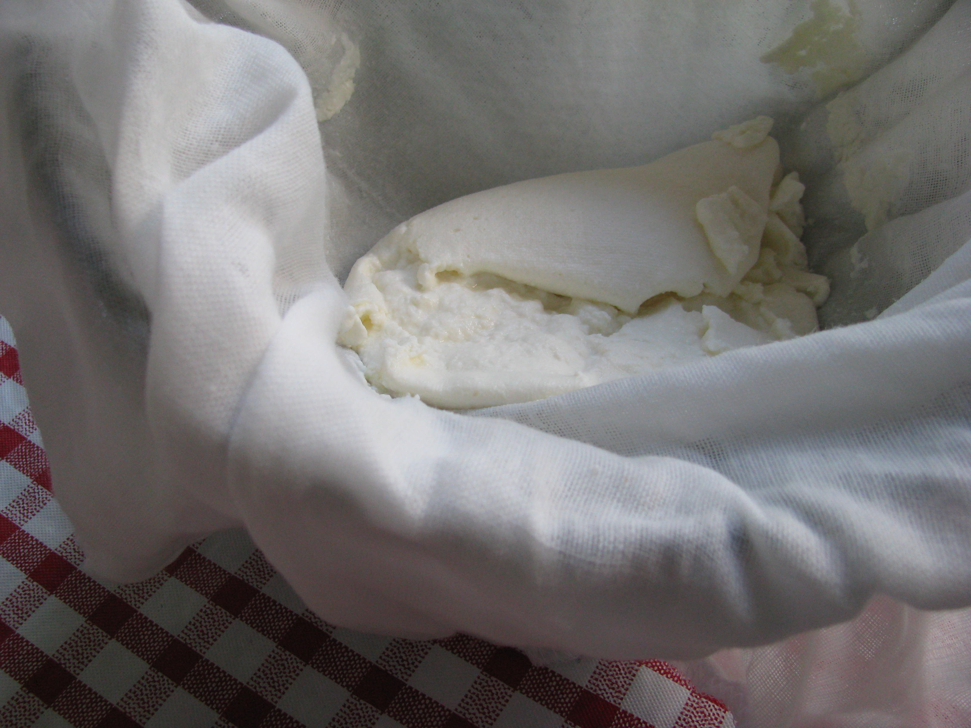 After draping a square of cheesecloth over a colander (actually I used my steamer basket because my colander was being used to make yogurt cheese), I poured half of the clabbered milk into the cheesecloth and tied the ends. When the whey is allowed to drain off, the end-product is clabbered cheese.