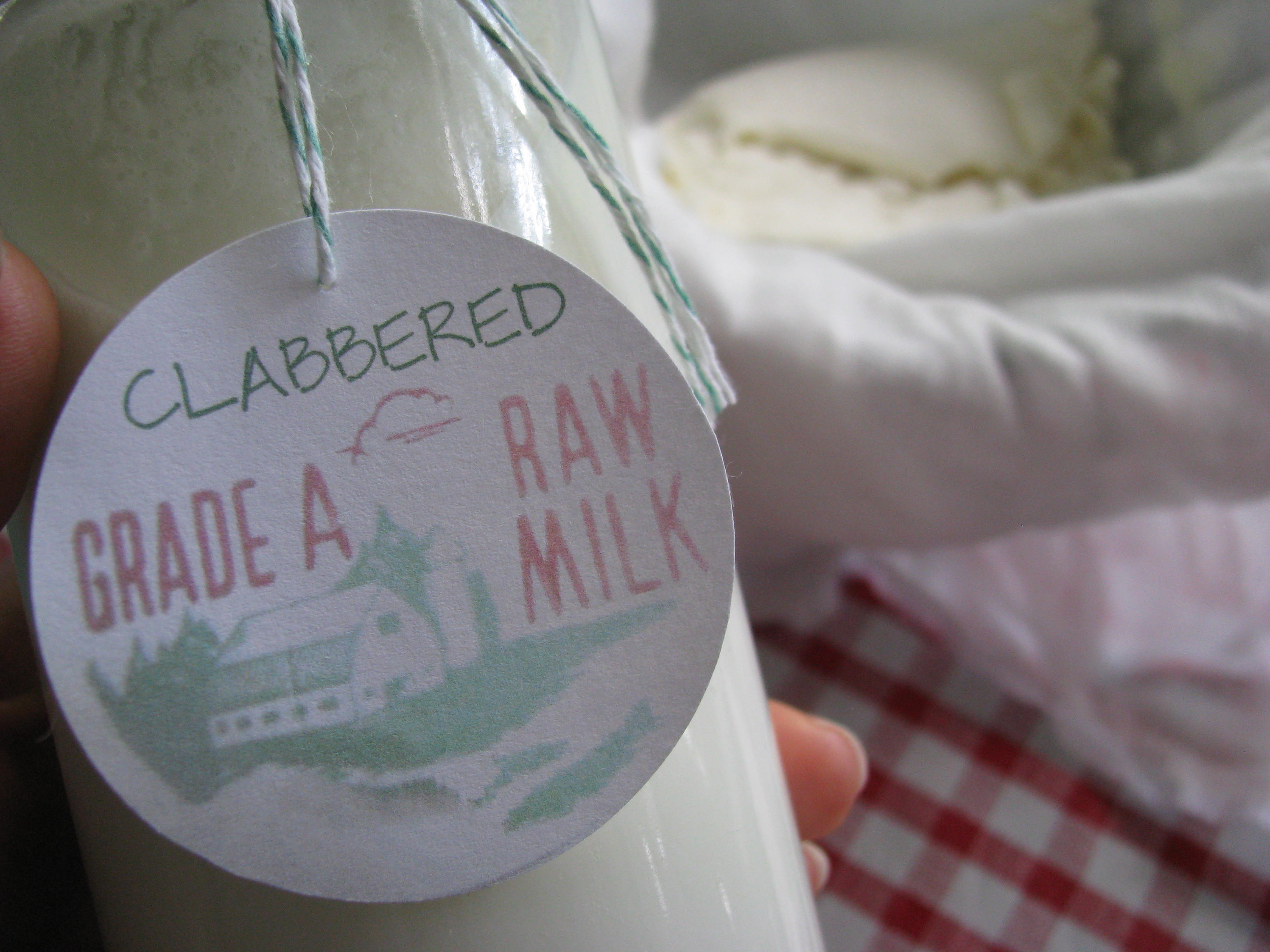 To elevate sour milk's less-than-popular reputation to a level that it deserves nutritionally, I created a special jar label to identify its contents. To make it, I scanned a vintage milk bottle cap into my computer, "erased" the dairy's name, and added the word clabbered in its place. After printing it, a quick spin of the wrist with my circle cutter and a short length of twine… done! Since I'm finding that I have several jars of various dairy products simultaneously culturing in the fridge and on my kitchen counter, I'm going to make these labels for each of the different processes, get them laminated at an office supply center, maybe insert each in a circular metal rimmed tag, and they'll be ready for instant identification. I will use the clabbered milk… don't ya love the name… as a recipe substitution for buttermilk or yogurt.