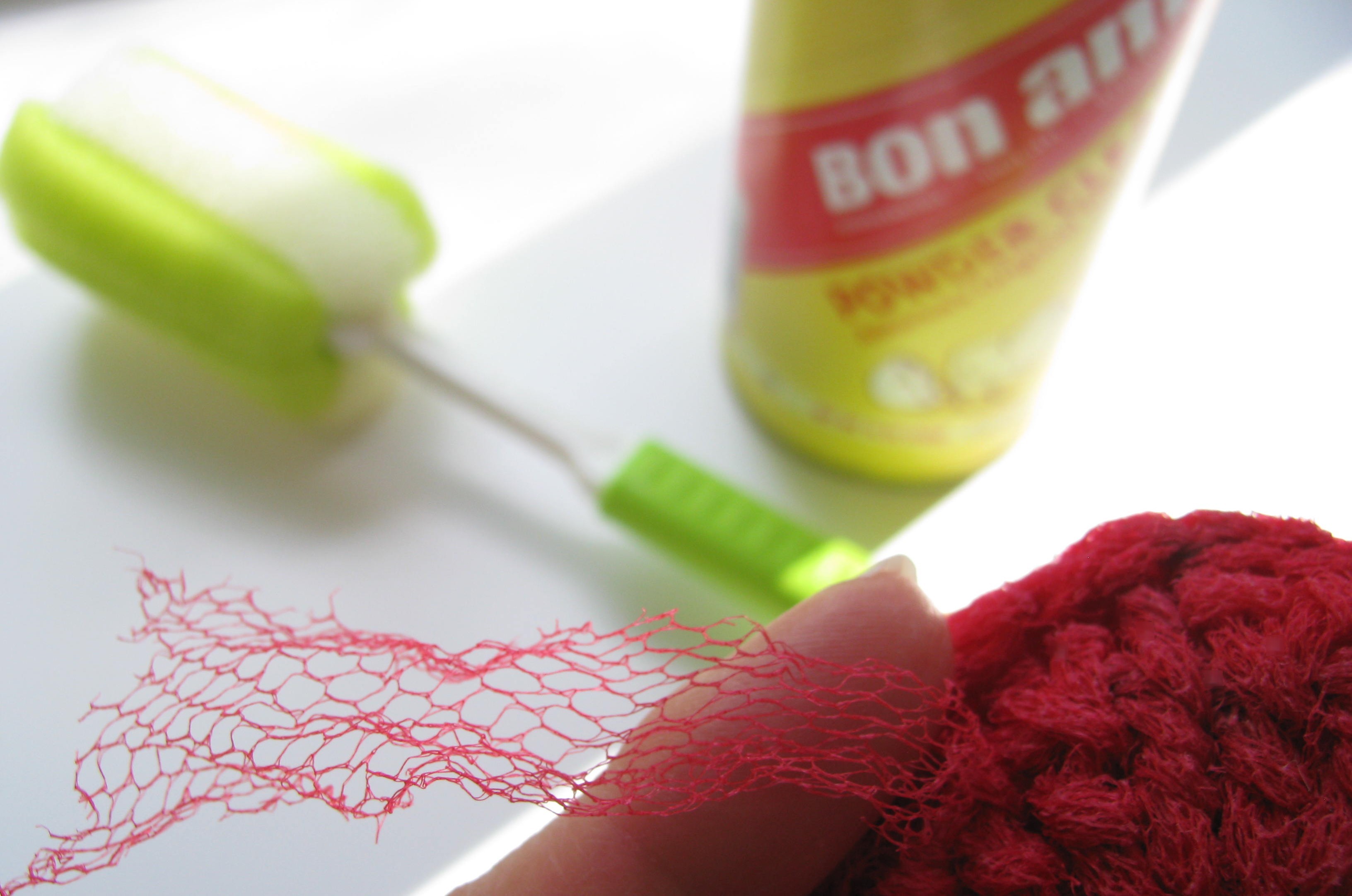 The hand crocheted or knitted scrubber is made from netting. I learned that tidbit of info after my curiosity led me to pull a bit of material out of the scrubber's center. In most instances, the scrubber is all that is needed to snuff out a stubborn spot in a pan's bottom. With a squirt of dish soap, it's also perfect for cleaning wooden cutting boards. Toss it in the washing machine's hot water cycle and it's good for another round.