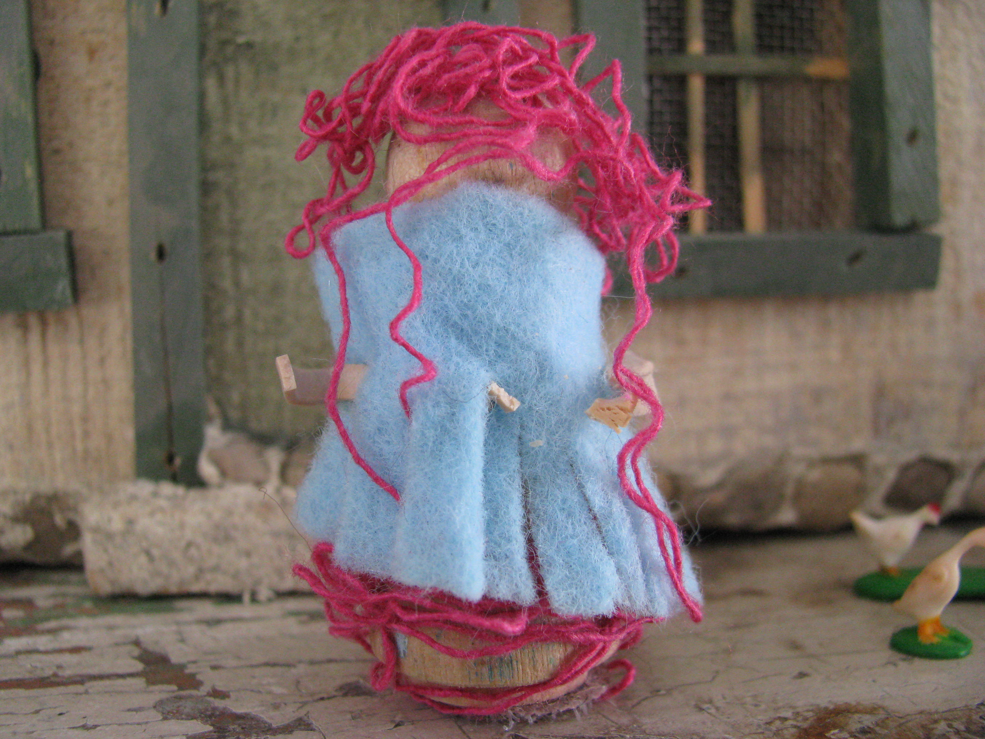 But wait, there must be someone to keep house and care for the animals on my farm. In a flurry of activity, Lizzy was created by my granddaughter, M, from a wooden knob, felt, string, and a rubber band.