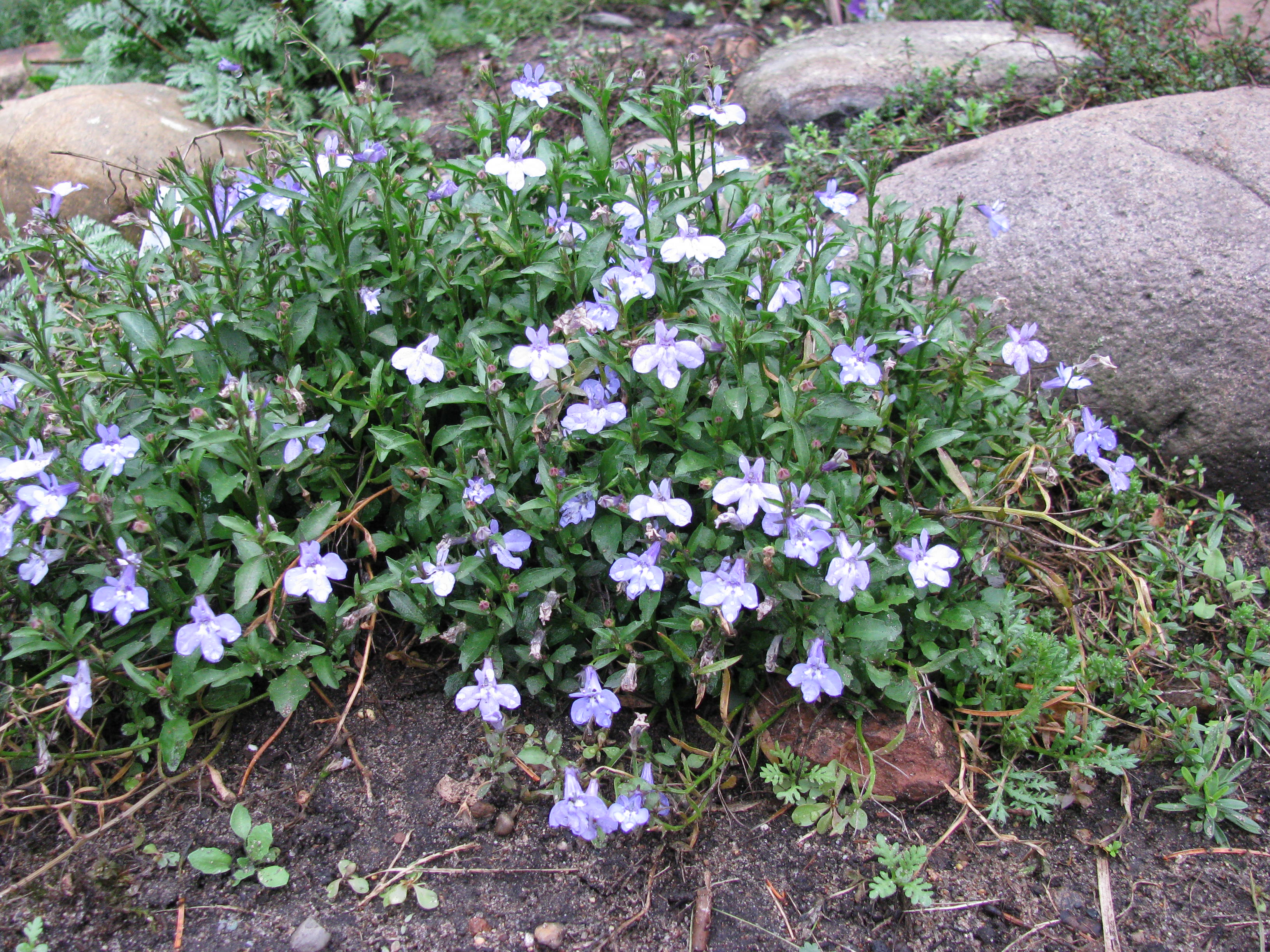 This annual (lobelia), sprinkled with tiny delicate blue blossoms, is shown in the top photo planted to the walkway's left side. It was one of the "root bound potted annuals that I had unintentionally neglected" until Tom lovingly breathed new life into it. He was confident that it would quickly revive with water and space to grow. He was right.