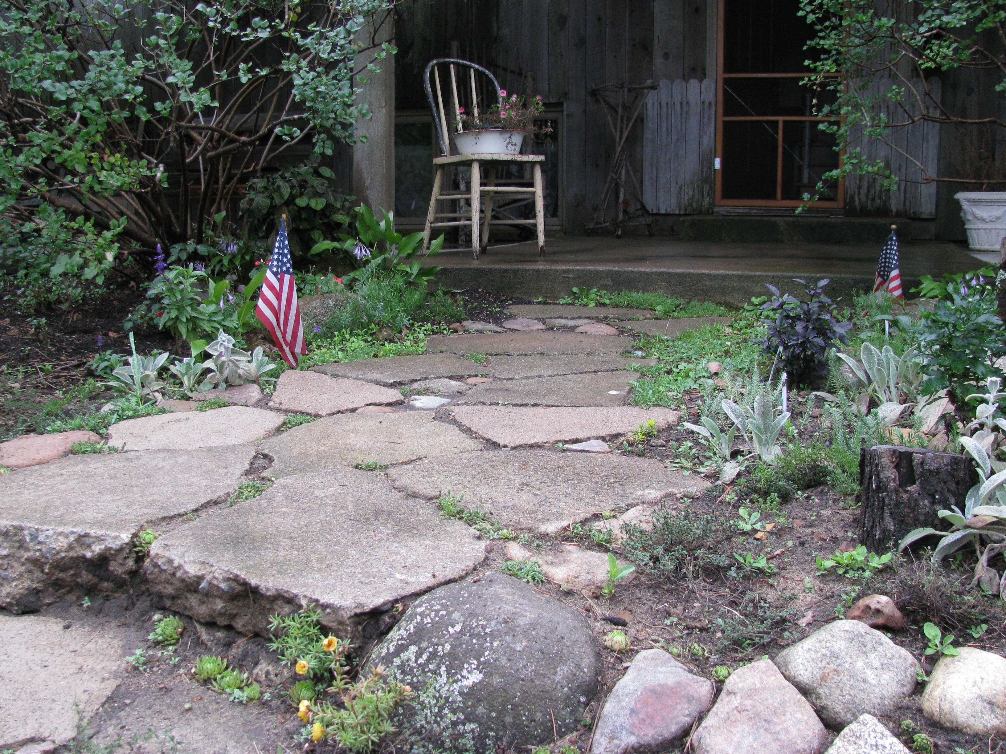 After Tom Dix from Wood Spirit Gardens in Backus, Minnesota completed the walkway, he trimmed two Dwarf Korean Lilac Bushes that had grown well beyond their "dwarf" status and were blocking the front porch view. Next, he continued his magic by artfully creating a woodland garden on each side of the stone path. He scouted our property for moss-covered logs, sheets of moss, groundcover (e.g., thyme, sedum, hen and chicks), stones in varying sizes, perennials begging to be divided, root bound potted annuals that I had unintentionally neglected, and salvaged discarded plants from local greenhouses that rapidly began to thrive when planted in the ground. My little woodland garden quickly took shape with visions of fairies and gnomes making their home in the tree stump (right side of photo) created when Dick sawed off a dying jackpine that, in its prime, resembled a Charlie Brown Christmas tree. Sweet.