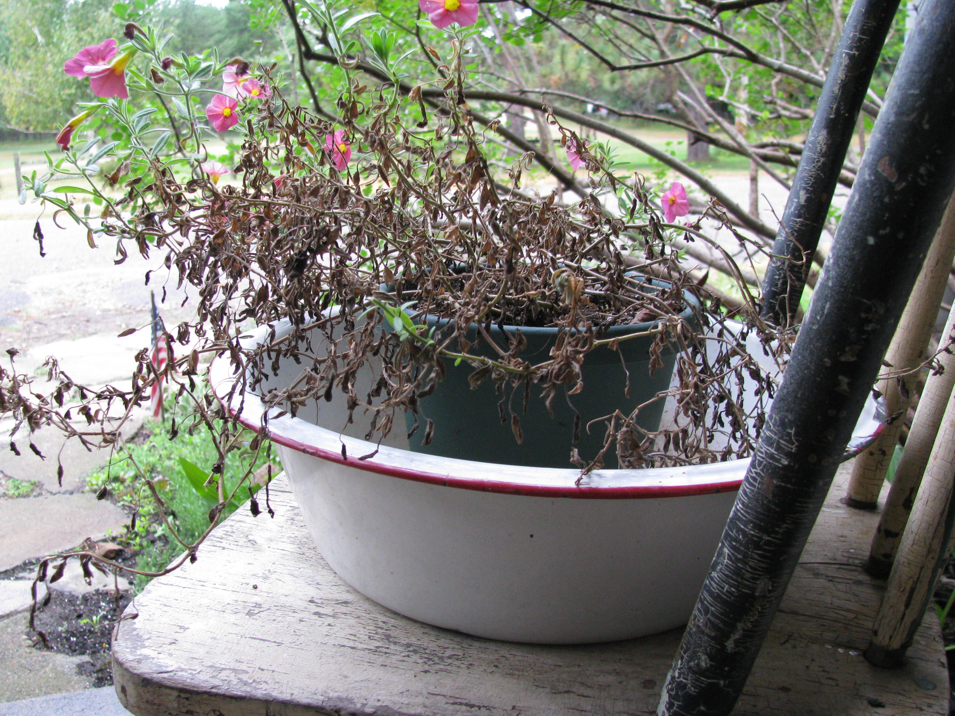 It formerly looked sickly like this callie coral pink "calibrachoa" annual, which is one of my favorite (I have many favorites) annuals. I have followed Tom's lead by finding a new home for it in my lovely woodland garden. Callie will soon be sporting fresh green leaves and heavily-laden pink blossoms with happy yellow centers.