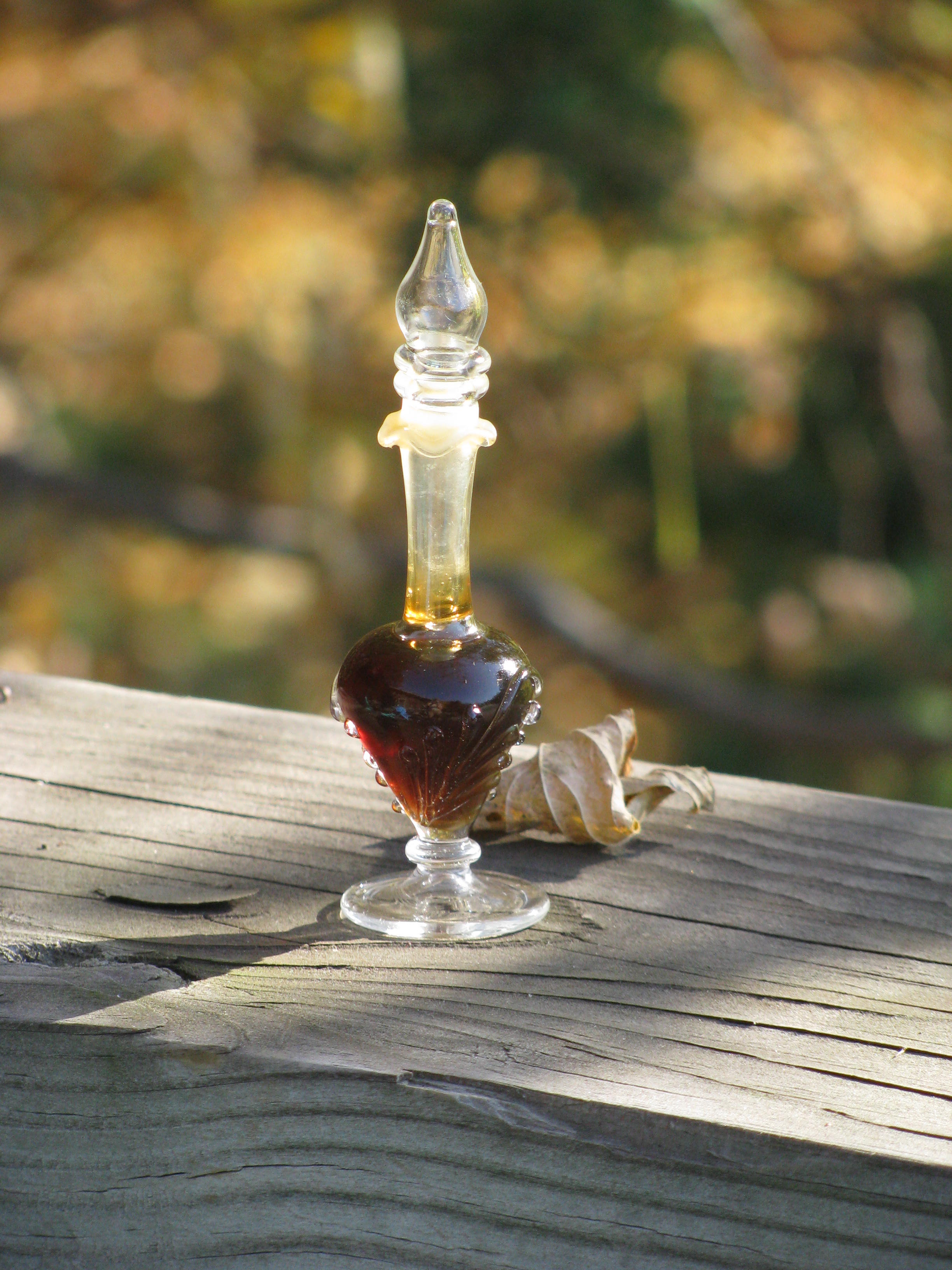 This patchouli oil sparkled in the afternoon sunshine where I set it atop a porch railing with the autumn-leafed trees in the background. The genie-in-a-bottle flask is as special as its contents. It was one of those unique-to-me sort of gifts that only comes by way of someone who knows you as well as you know yourself. In this case, it was my daughter Heather.