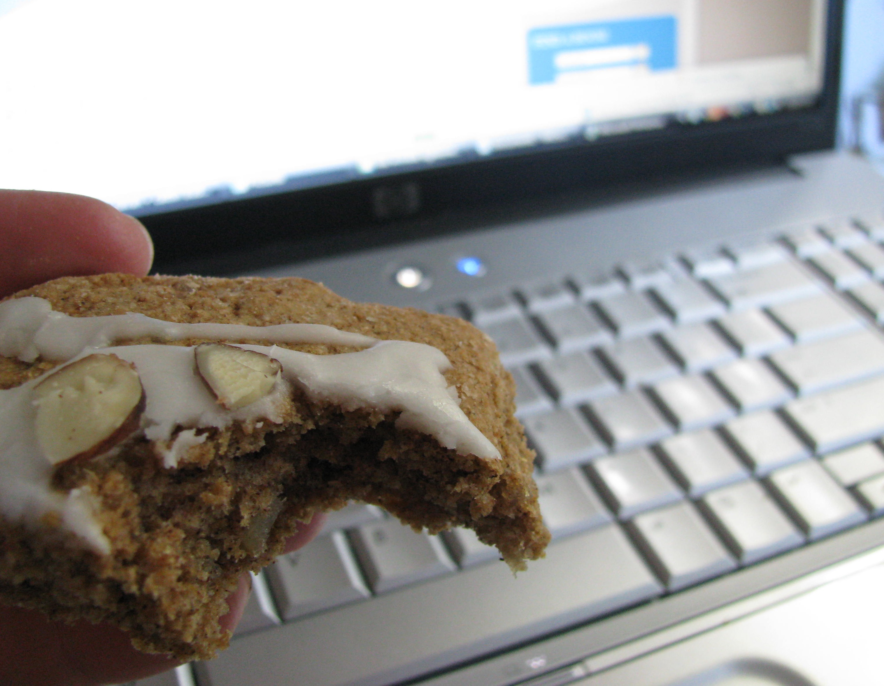 Preheat oven to 400°. Line a baking sheet with natural parchment paper. In a large bowl, whisk together dry ingredients. Using a pastry blender, mix butter into dry ingredients until it is pea-size. Mix together milk and almond extract, then add to flour mixture. Stir until dough just starts to come together. Stir in candied ginger. Dough should be thick and slightly sticky, not dry. On a lightly floured surface, pat dough into a large circle about ¾ to 1-inch thick. Cut into 8 wedges and arrange on baking sheet, allowing room to spread. Bake for about 15 minutes until scones are lightly browned. (Don’t be tempted to bake longer than a couple more minutes, if you think it’s needed, as they will be too dry.) Cool on wire rack for 15 minutes before glazing. (Following is a cream cheese glaze that was included with this scone recipe. However, I just made a quick glaze of powdered sugar, a couple drops of almond extract, and a little drizzle of milk… just enough so it’s thick but runs off the end of a spoon. I topped each scone with a few sliced almonds.)