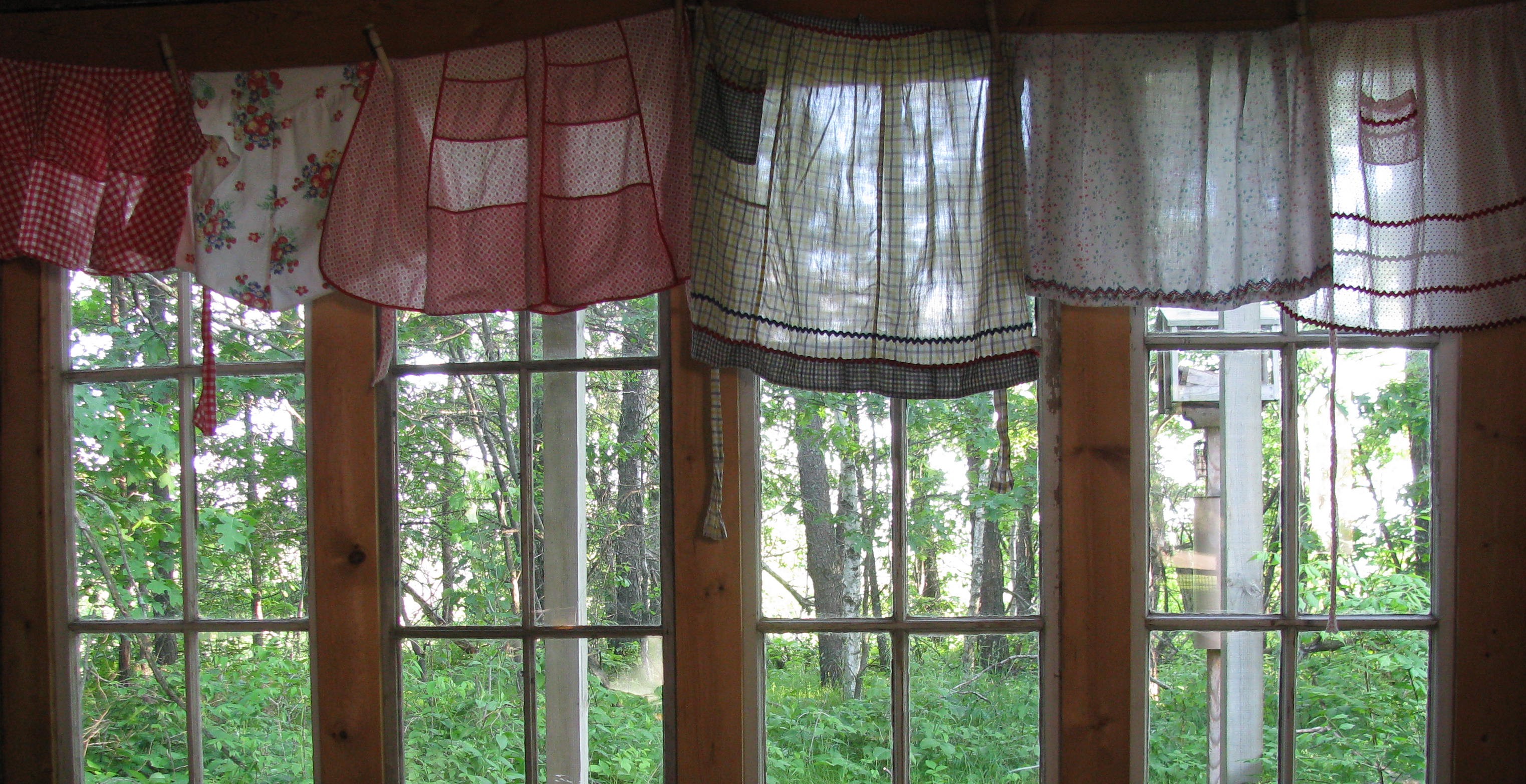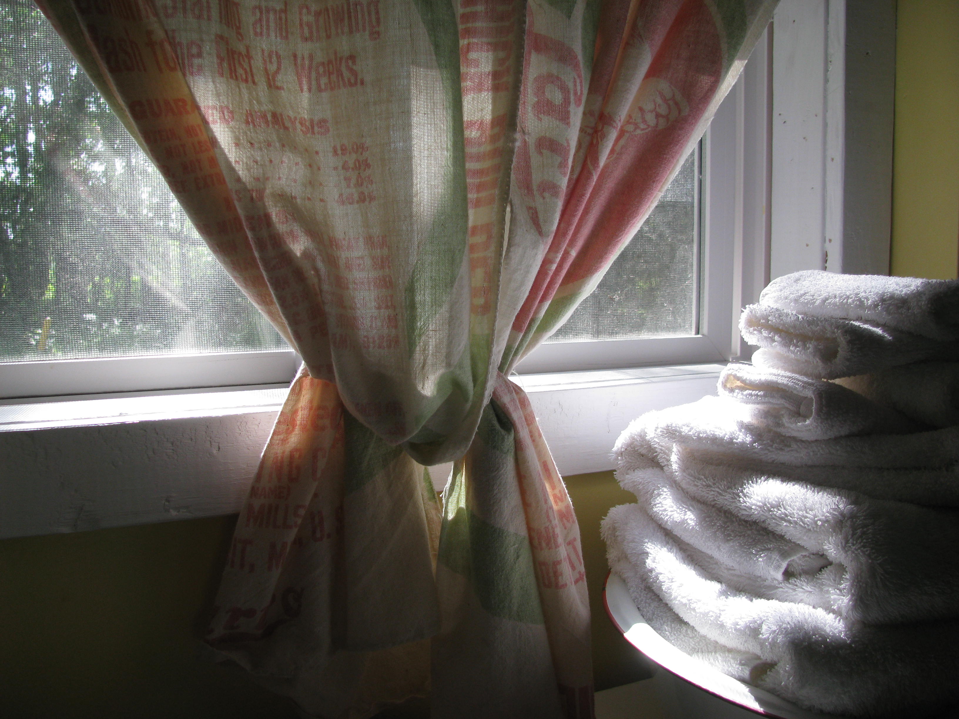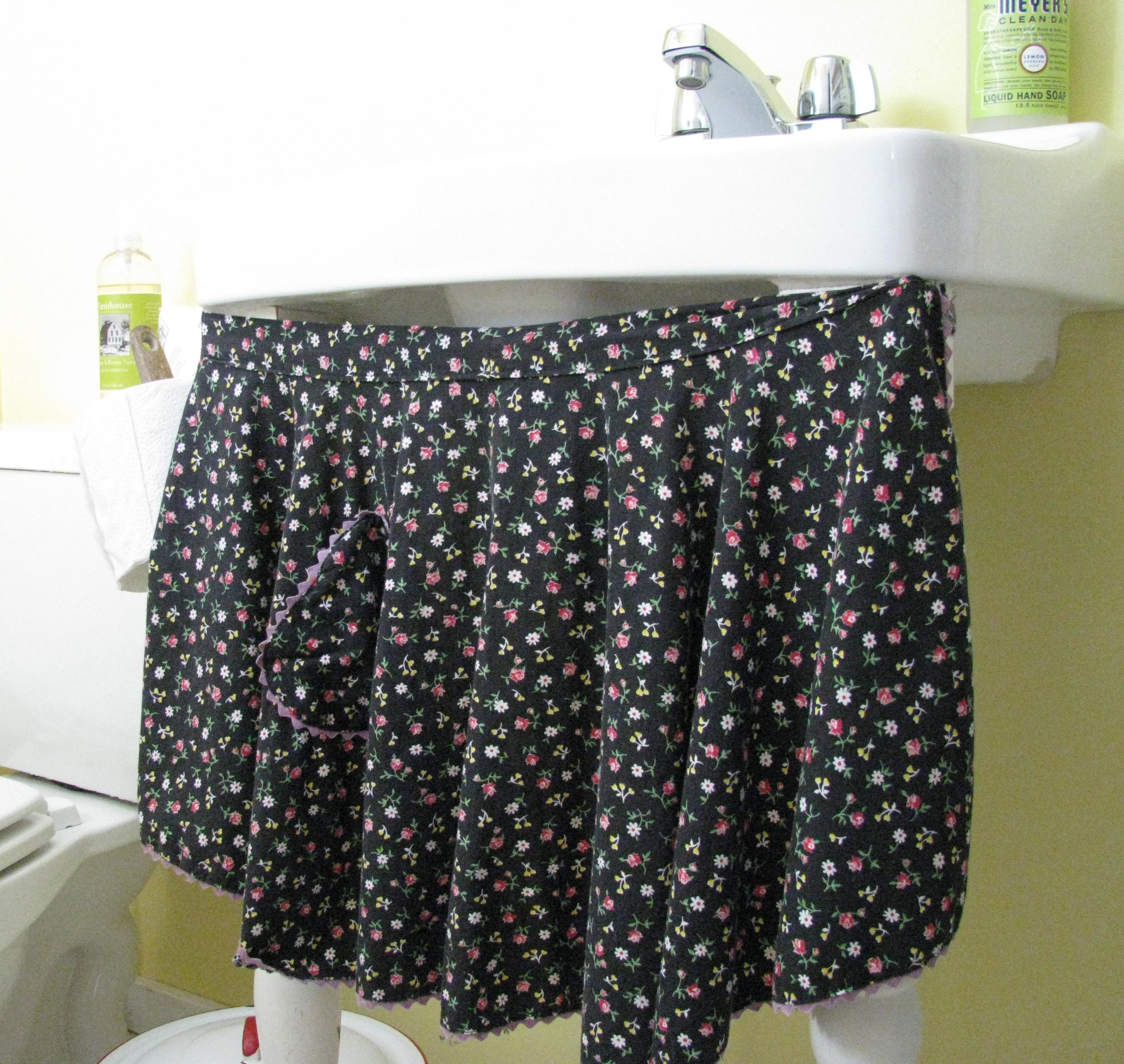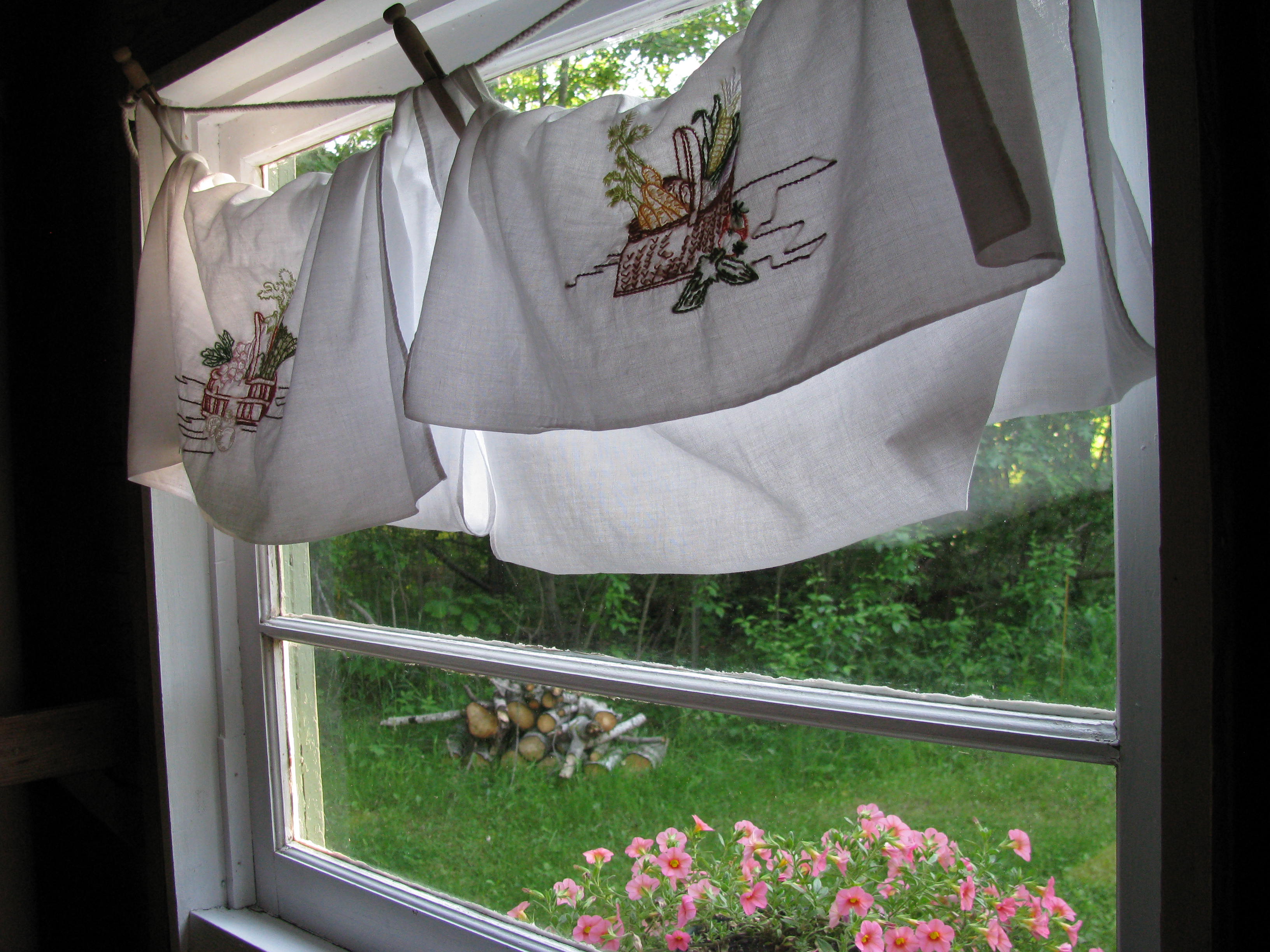 Once the use of aprons, tablecloths, and dishtowels for window treatments becomes second nature, you'll be seeing other applications for them, as well. An apron makes a sweet covering for the front of a pedistal sink. Even kitchen utensils are perfect for repurposing. An old slotted spoon becomes a holder to secure a roll of bathroom tissue. Oh, yes. Nothing your eyes fall upon will be seen in the same light. No, not ever.