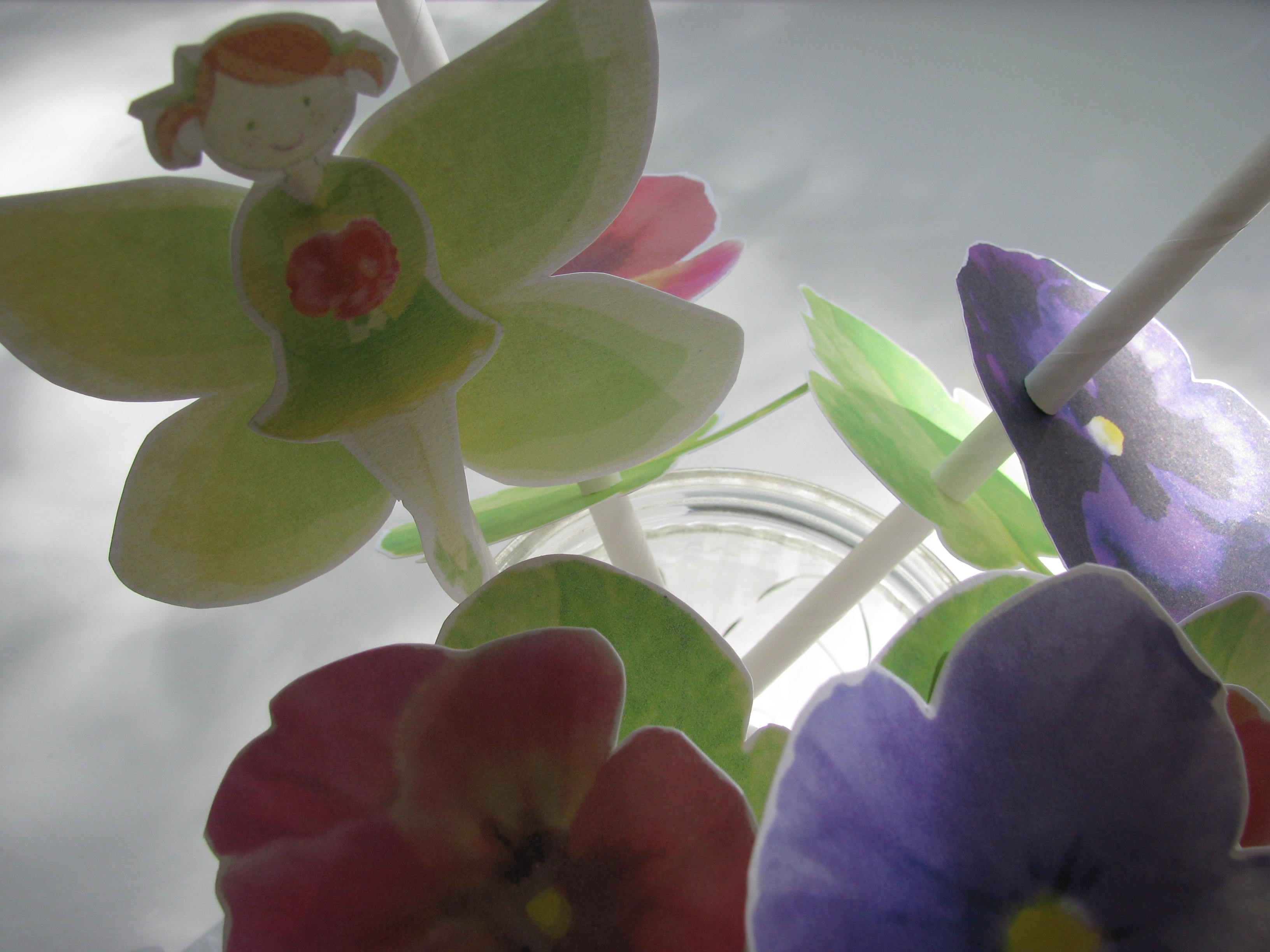 The blossom straw toppers, fairy cupcake toppers, plus additional sweetness can be found in my daughter Heather's fairy blossoms party play kit. The paper straws are available in my daughter Jessie's online fort and field shop. Jess sells purple/white and green/white striped straws that would be oh-so-pretty with these blossoms, too. Sub plastic straws? Uh… no.