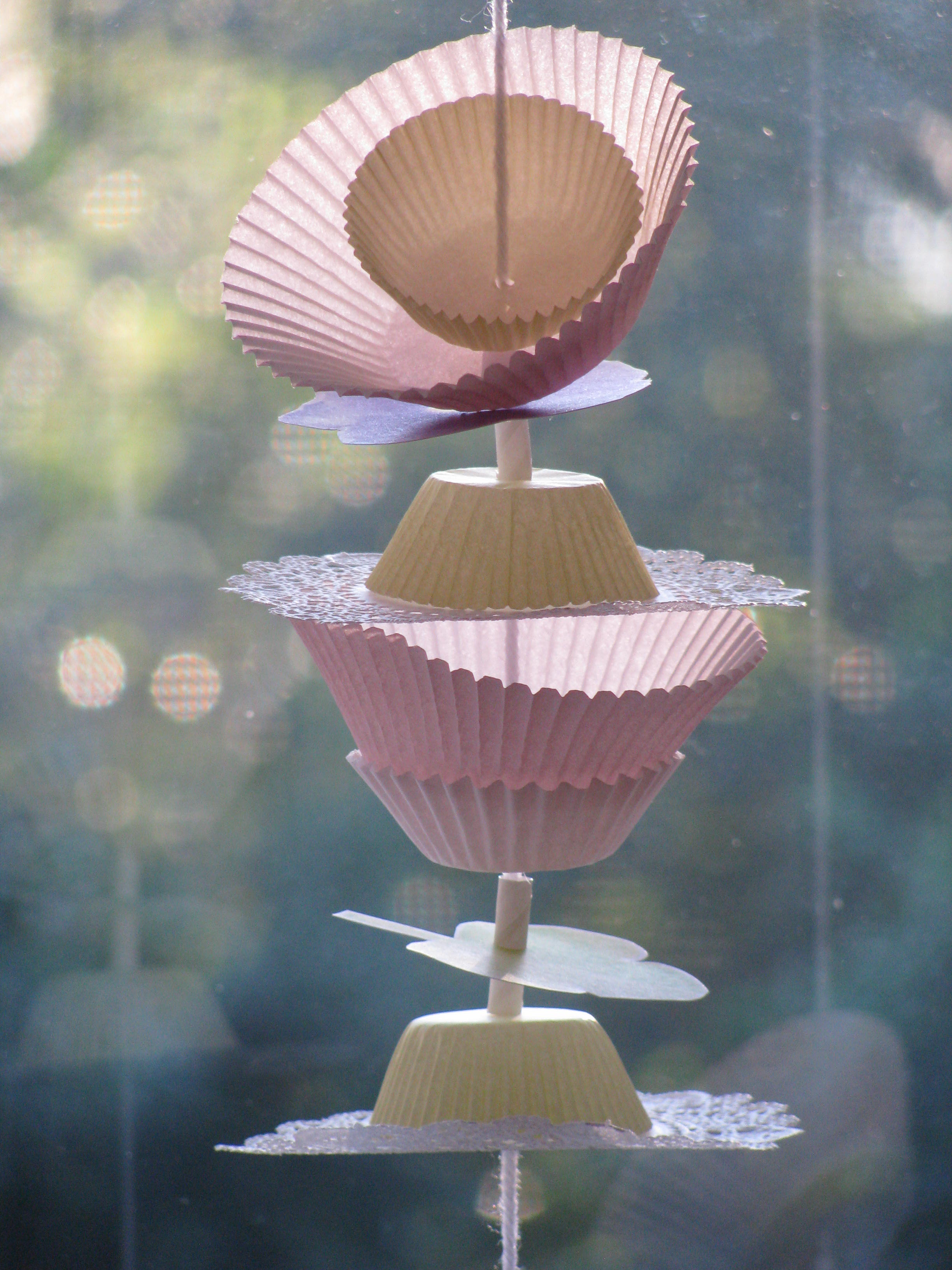 I also used a blossom and leaf from Heather's fairy blossoms party play kit in this cupcake liner garland. I made three garlands and hung them vertically at varying lengths in my window where the sunlight adds to the happiness.
