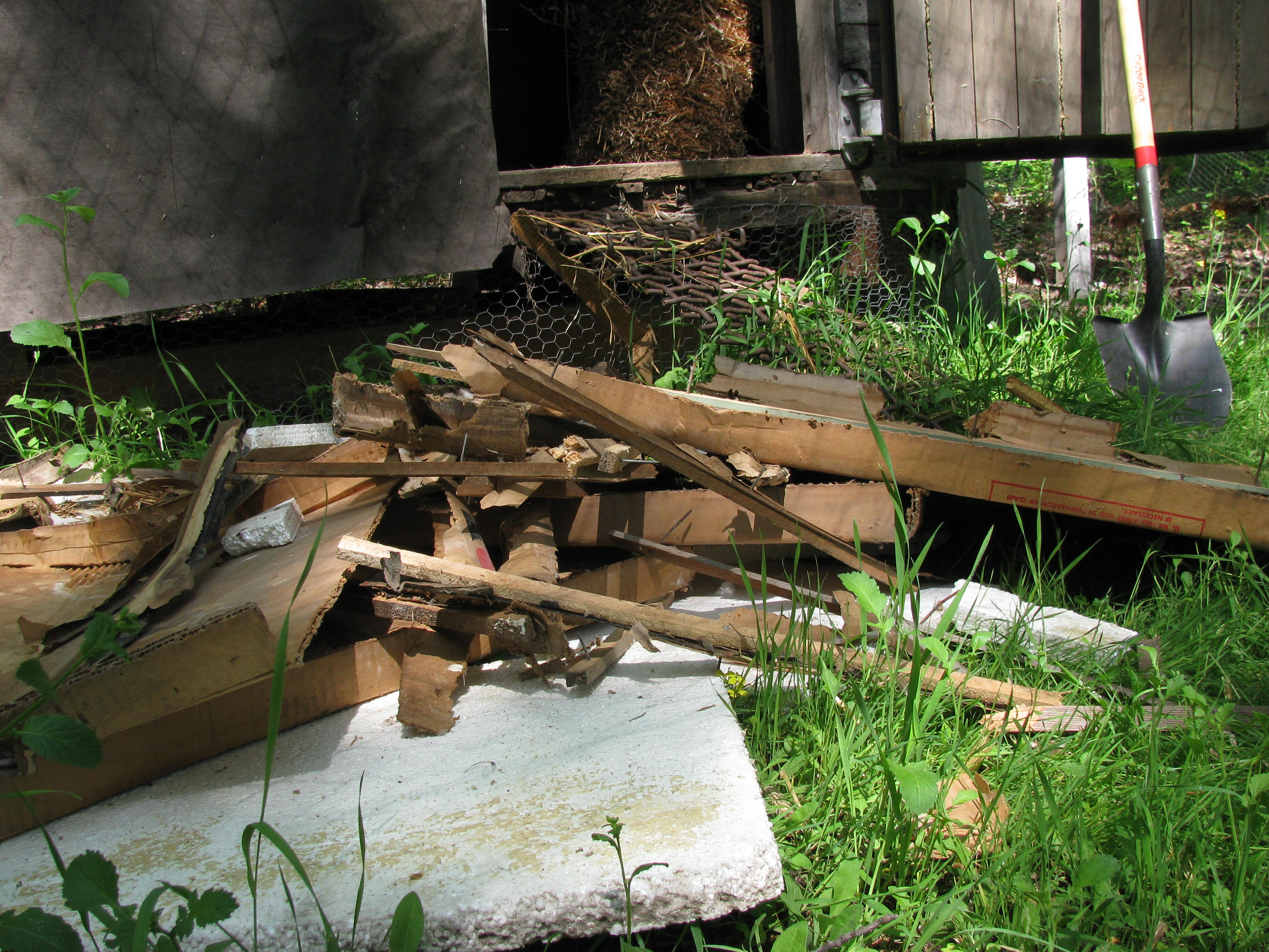 To prepare for the arrival of a flock of hens, that a local farmer raised from baby chicks for me, I loaded our shop vac and an extension cord into my wheelbarrow and headed to the chicken coop. Cobwebs daintily draped every corner. So very pretty glistening in the sun streaming through the windows, but they had to go. Since we don't house our hens over the winter, and trees shade the coop during the hot summer months, a few sporatic pieces of cardboard insulation hugging the coop's interior walls weren't necessary and they were in nasty condition. So, with chisel and hammer, I pried lathe loose that held the ragged cardboard insulation in place. Before I knew it, I had a huge pile of debris. Oops. I may have approached my task a wee bit aggressively.
