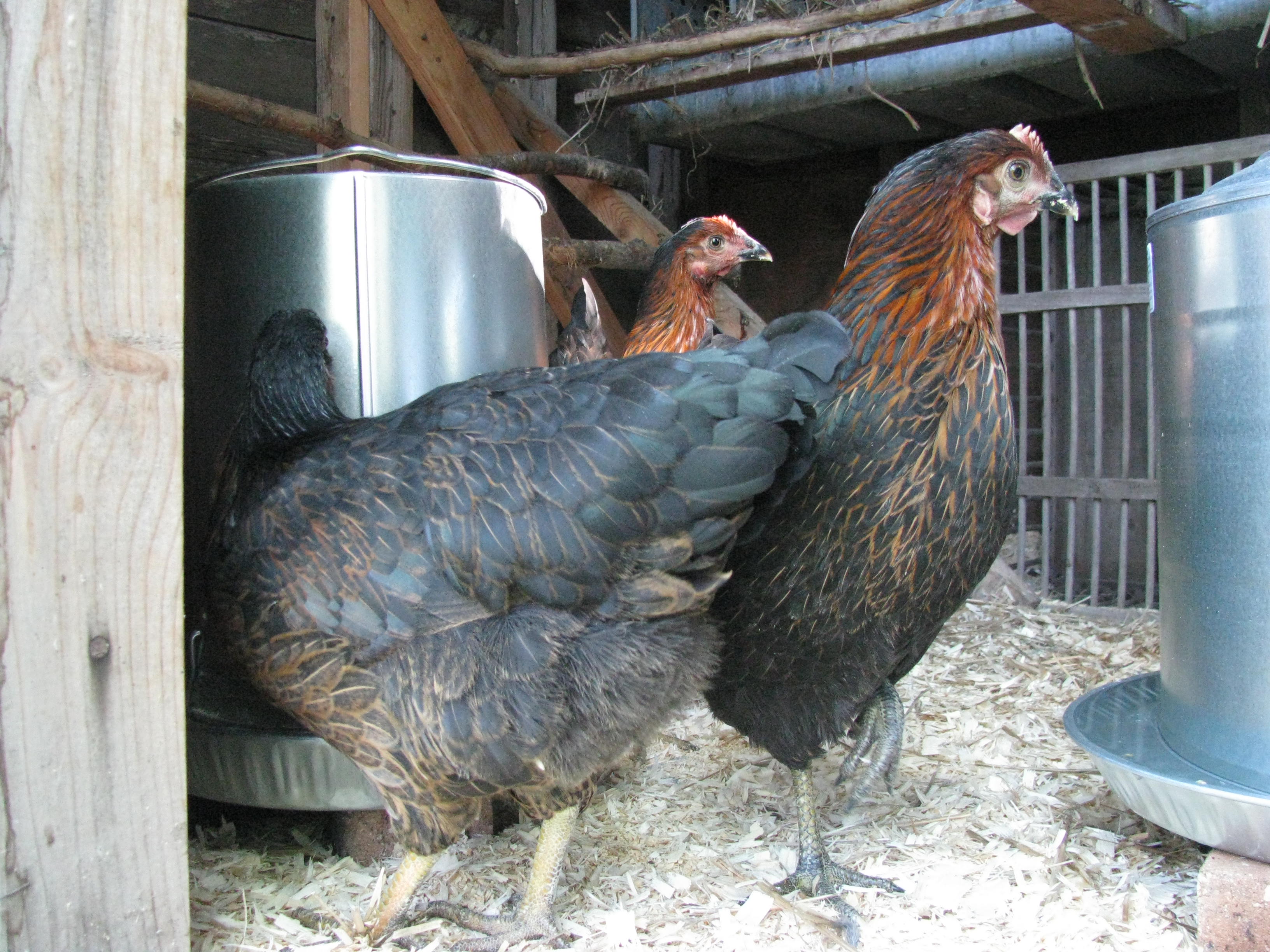 A Black Star is a first-generation hybrid chicken bred from a Rhode Island Red Rooster and a Barred Rock Hen. They are bred to be superb egg layers that lay five to six large brown eggs each week beginning at 19 1/2 to 20 weeks old. The adult males (roosters) are black with white barring, while adult females (hens) have gold feathers on the neck and breast. Black Star Chicks of both sexes are black, but a white spot on the head distinguishes the males. Hybrids, such as Black Stars, are not recommended as breeding stock because the chicks will not retain the same characteristics in future generations. (It's like saving seeds from hybrid vs. heirloom plants. Seeds collected from heirlooms for replanting in successive years will produce plants true to their parentage. Hybrids do not. New seed must be purchased each year.) I have no rooster and don't intend to hatch chicks, so this breed is a good choice for me. The only problem I have with my hens being hybrids is that man has messed with nature. We do too much of that.