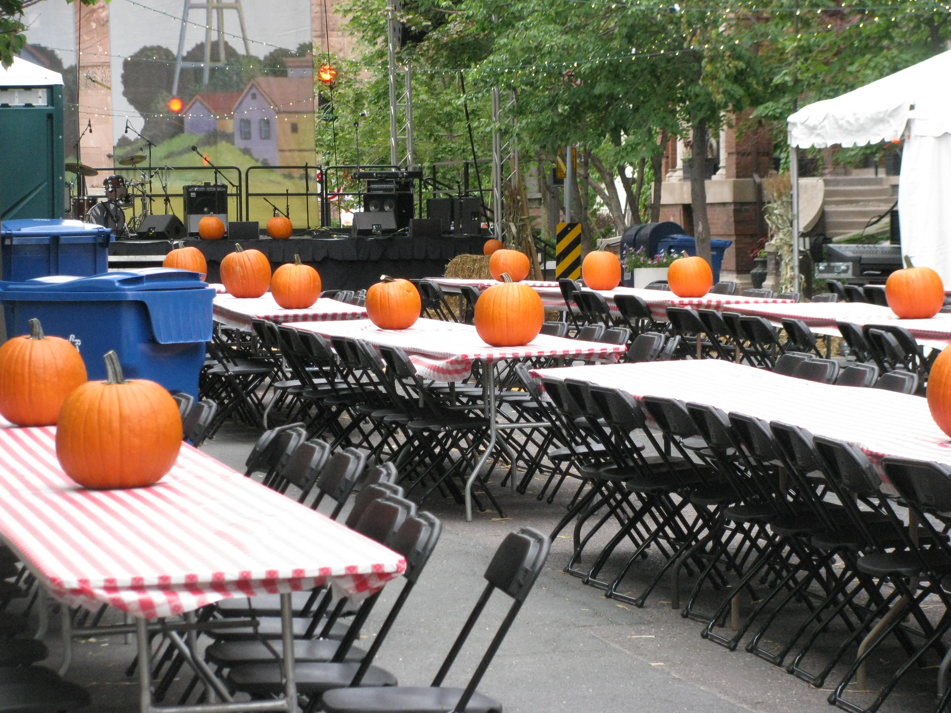 This particular performance was the season opener, so an annual $5.00 meatloaf supper and a free, open-to-the-public street dance capped off the evening. I snapped a photo of the outdoor dining area and Lake Wobegon stage backdrop set up on Exchange Street in front of downtown St. Paul's Fitzgerald Theater before we filed in to attend Garrison Keillor's performance… his 39th season.
